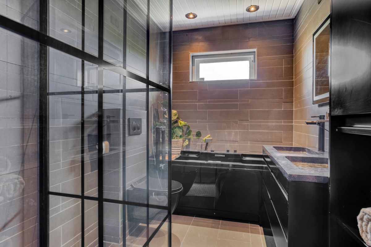 Badkamer voorzien van ligbad, douche, wastafel en toilet.