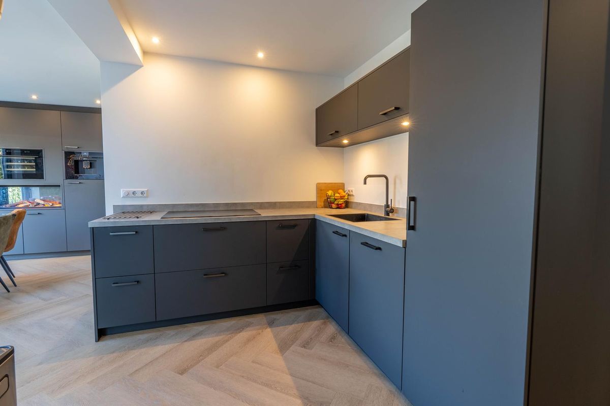 De L-vormige woonkamer is voorzien van een prachtige visgraatvloer en veel lichtinval dankzij de ligging op het zuiden. De begane grond is geheel verbouwd in 2022/2023. Ook ligt er vloerwarming. De moderne L-vormige keuken heeft een strak design en biedt volop werk- en opbergruimte. Hier vind je onder andere een inductiekookplaat en spoelbak. De keuken loopt door in de eetkamer, waar een stijlvolle kastenwand is geplaatst met een ingebouwde combi-oven met magnetron, koffiemachine en wijnklimaatkast. Kortom, alles wat een kookliefhebber zich kan wensen.