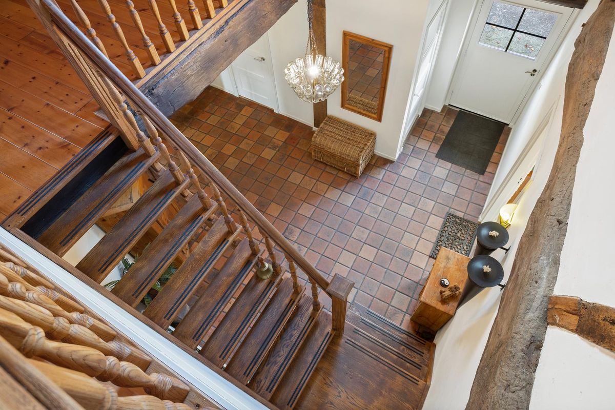 Vanuit de woonkamer bereik je de hal naar de oorspronkelijke voordeur en de tweede trapopgang naar de verdieping.