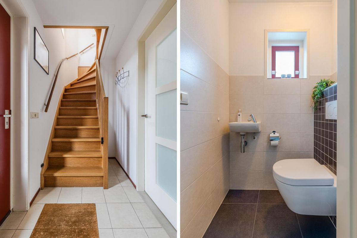 Vanuit de hal met tegelvloer heeft u toegang tot de woonkamer. In de hal bevindt zich het toilet, meterkast en de trap naar de 1e verdieping.