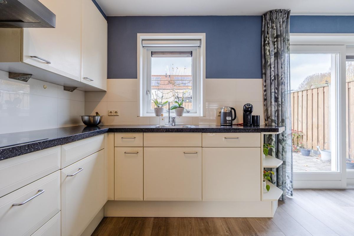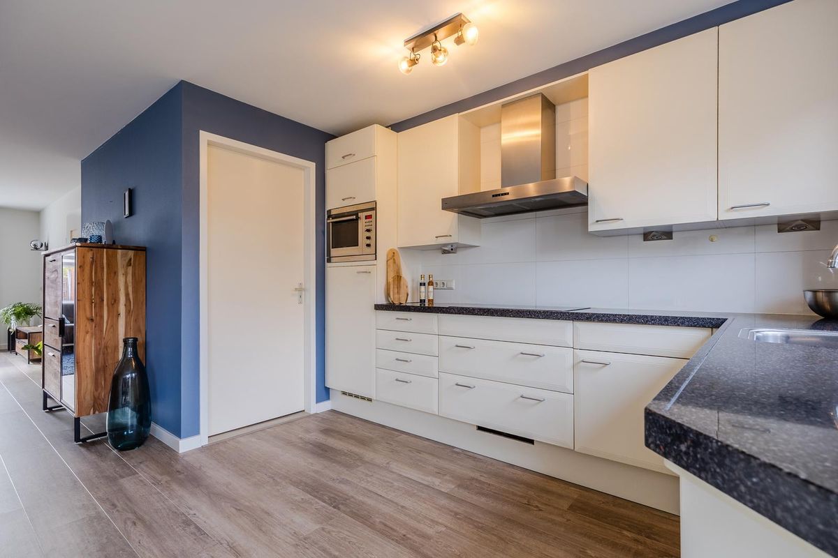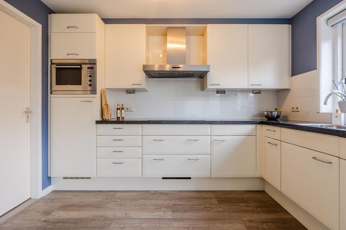 De open leefkeuken met laminaatvloer is voorzien van een natuurstenen aanrechtblad en inbouwapparatuur: Inductie kookplaat, combi-oven, afzuigkap, vaatwasser en een koelkast. Vanuit de keuken heeft u zicht op de achtertuin. Via de keuken heeft u toegang tot de bijkeuken.