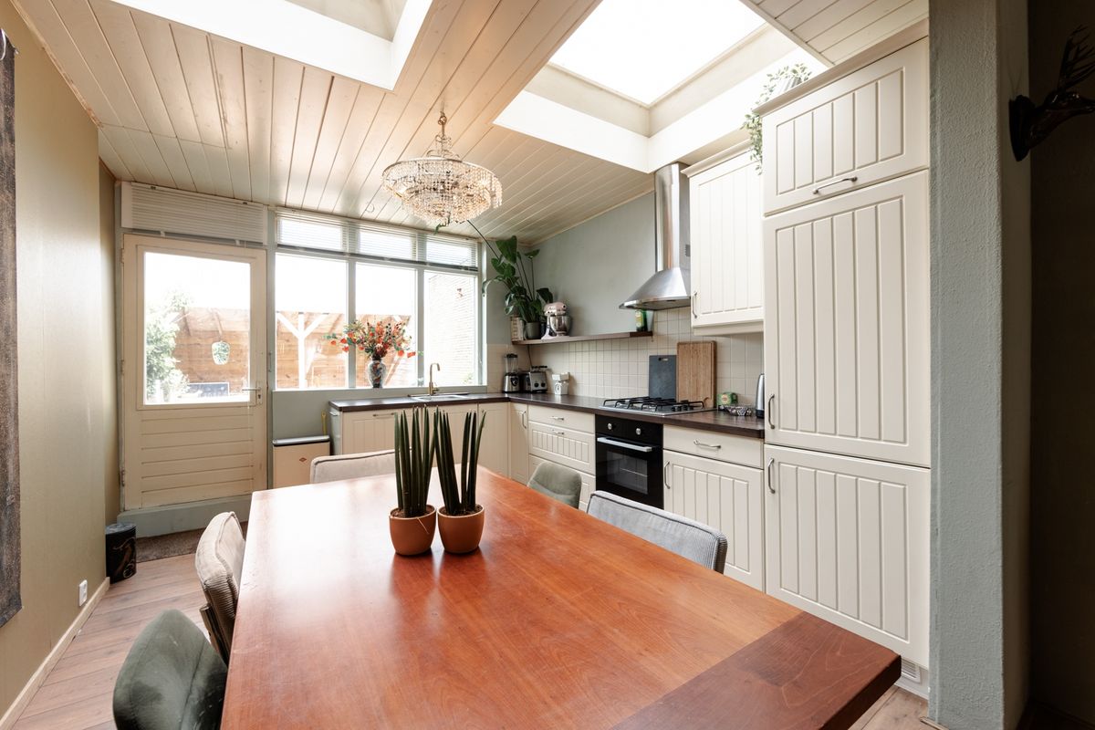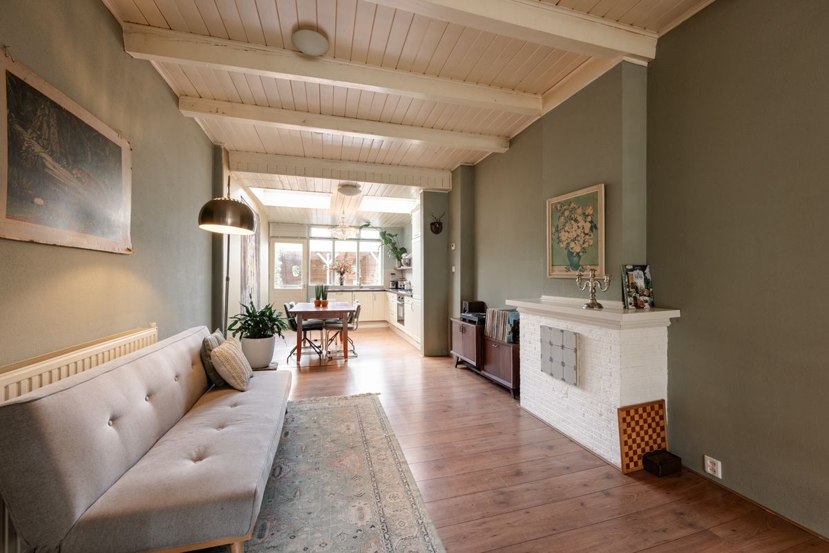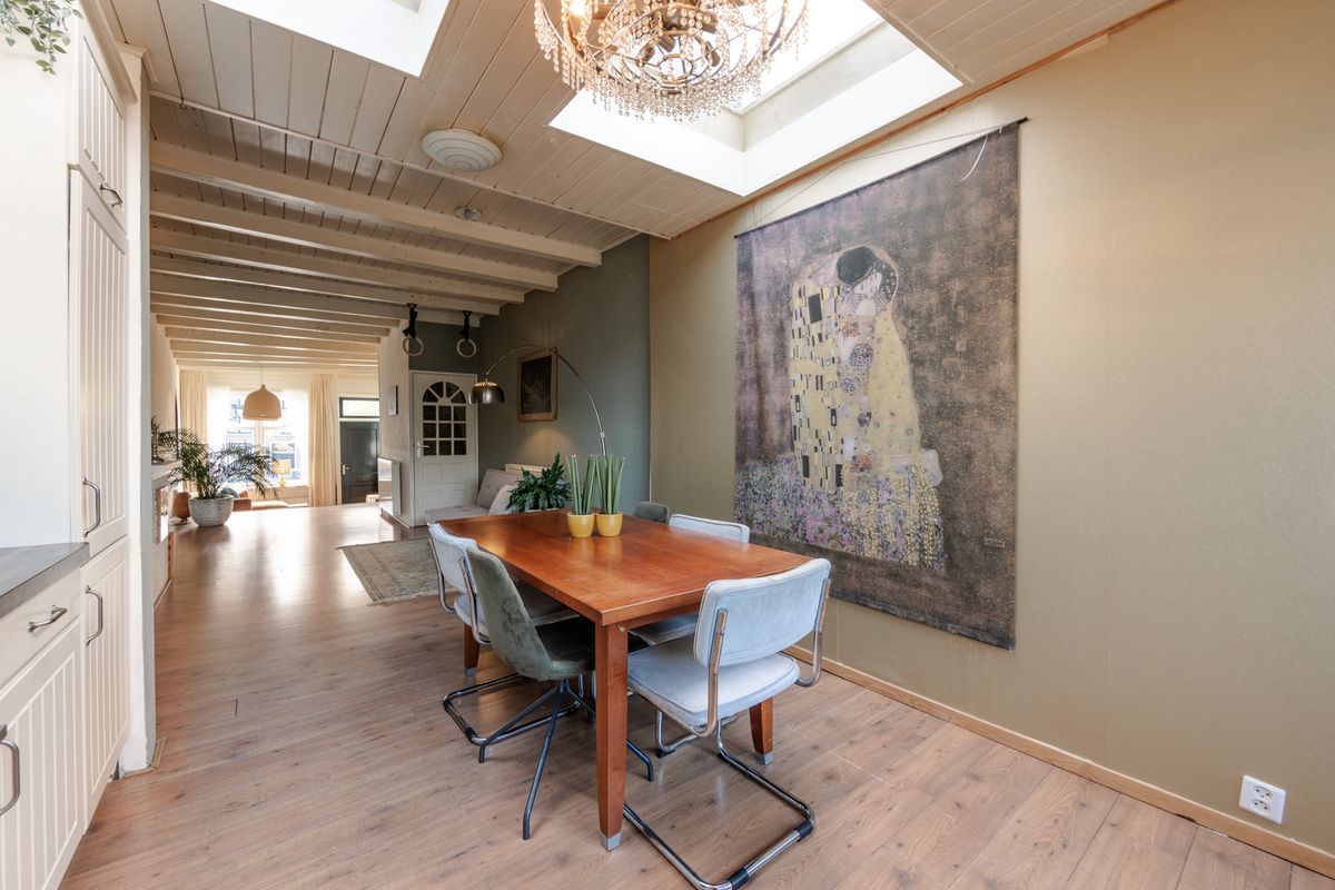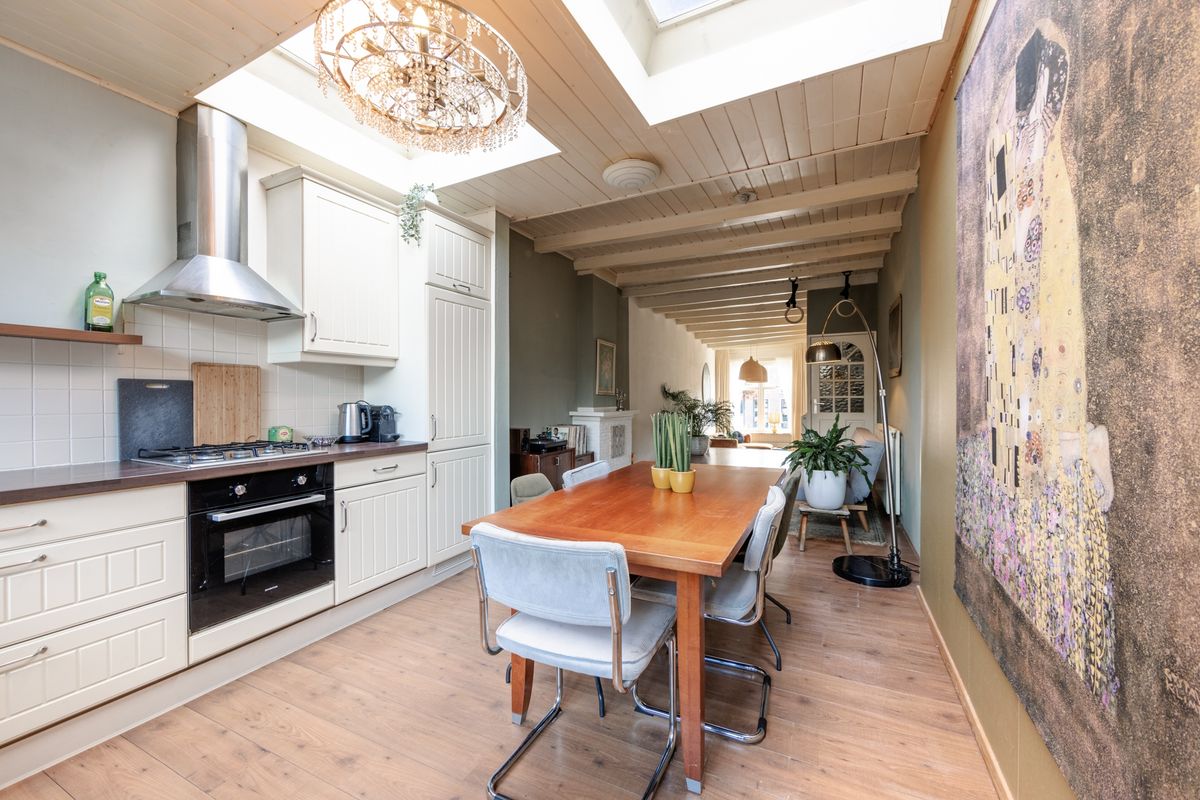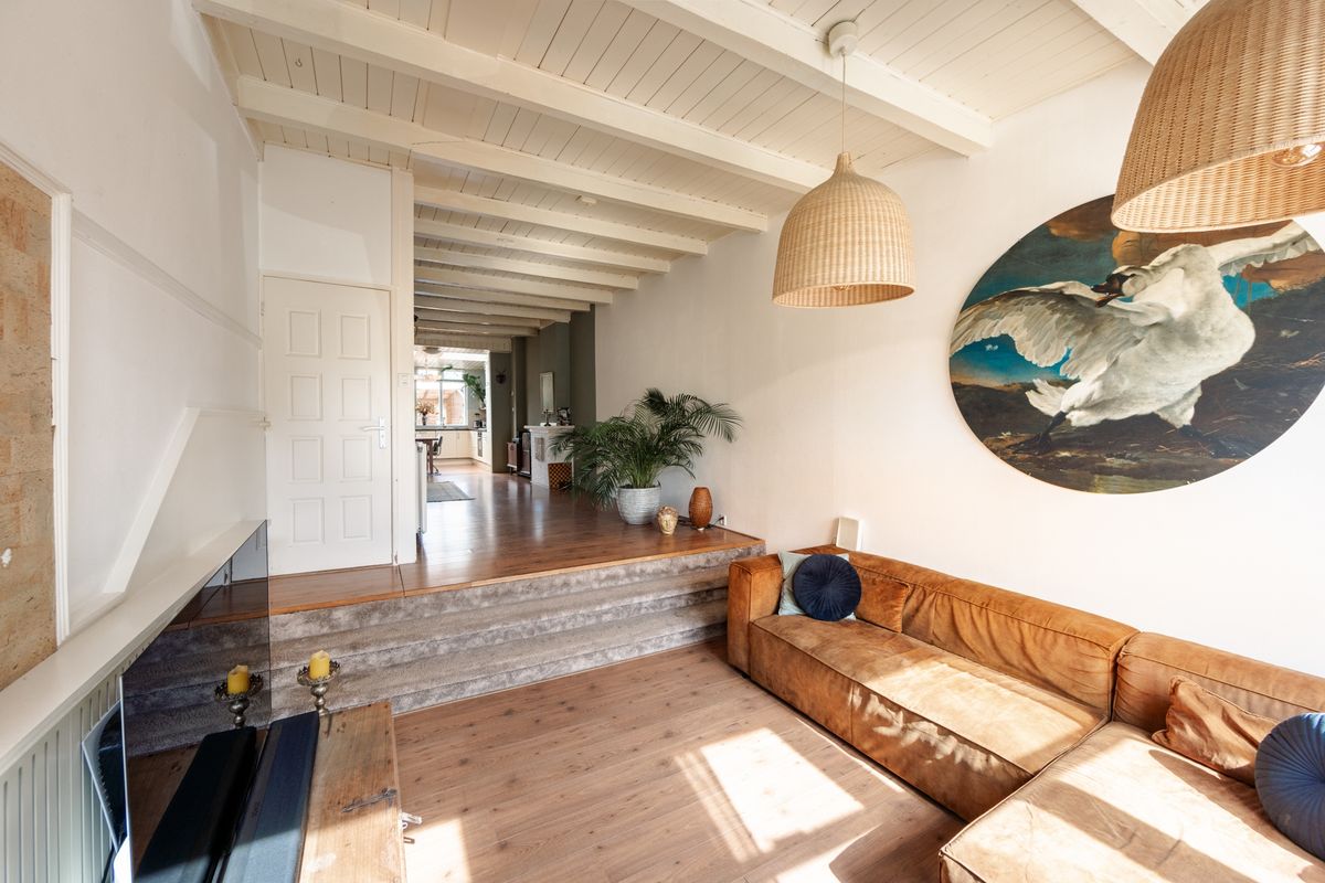 De sfeervolle woonkamer heeft een hoog balkenplafond en een opstap naar de woonkeuken. Die maar liefst 5 meter is uitgebouwd en voorzien is van lichtkoepels. In de 9 meter diepe achtertuin met overkapping kun je heerlijk van de zon genieten.