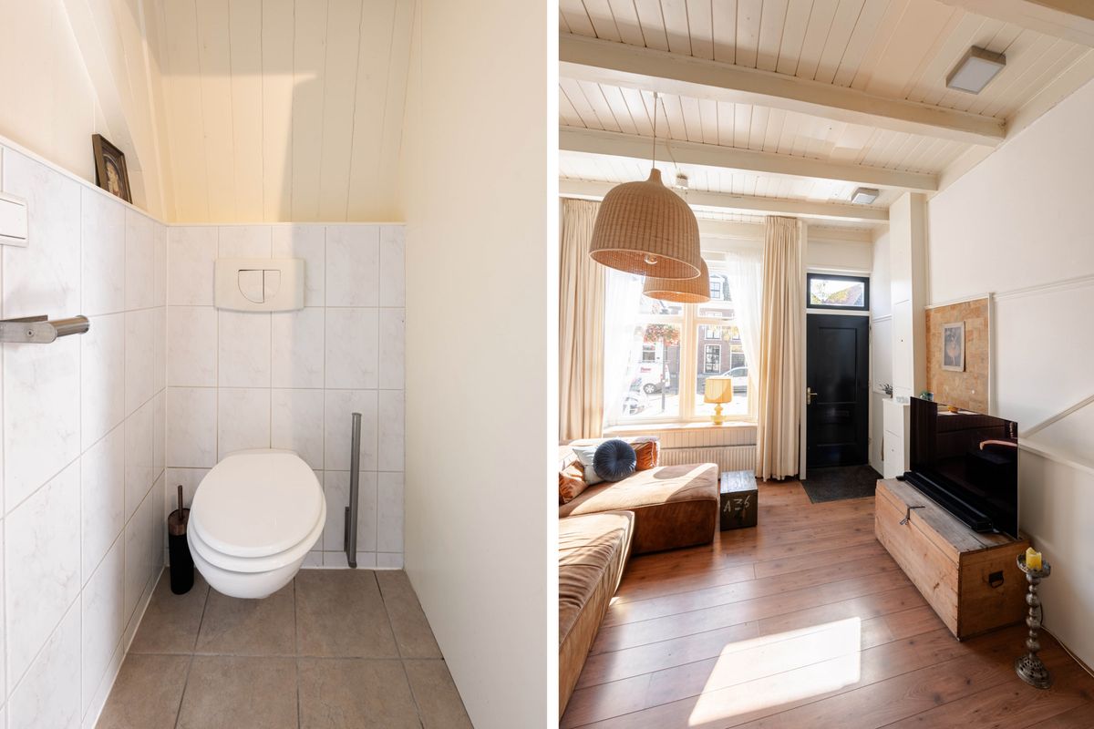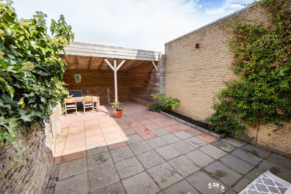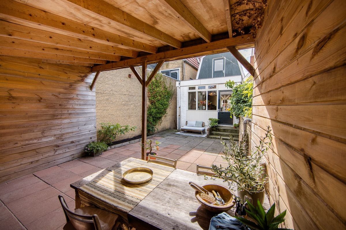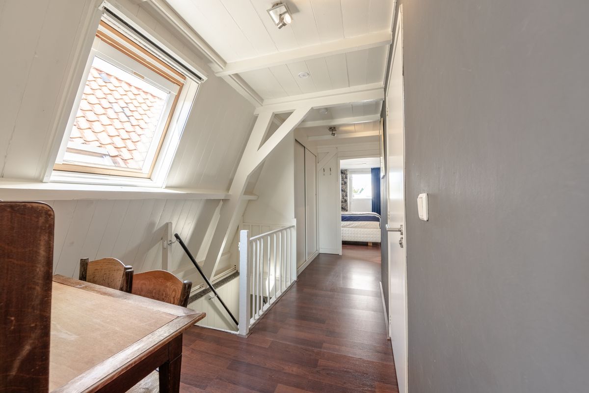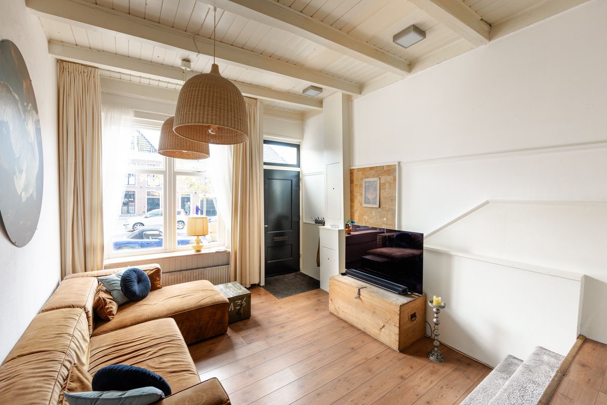 De sfeervolle woonkamer heeft een hoog balkenplafond en een opstap naar de woonkeuken. Die maar liefst 5 meter is uitgebouwd en voorzien is van lichtkoepels. In de 9 meter diepe achtertuin met overkapping kun je heerlijk van de zon genieten.