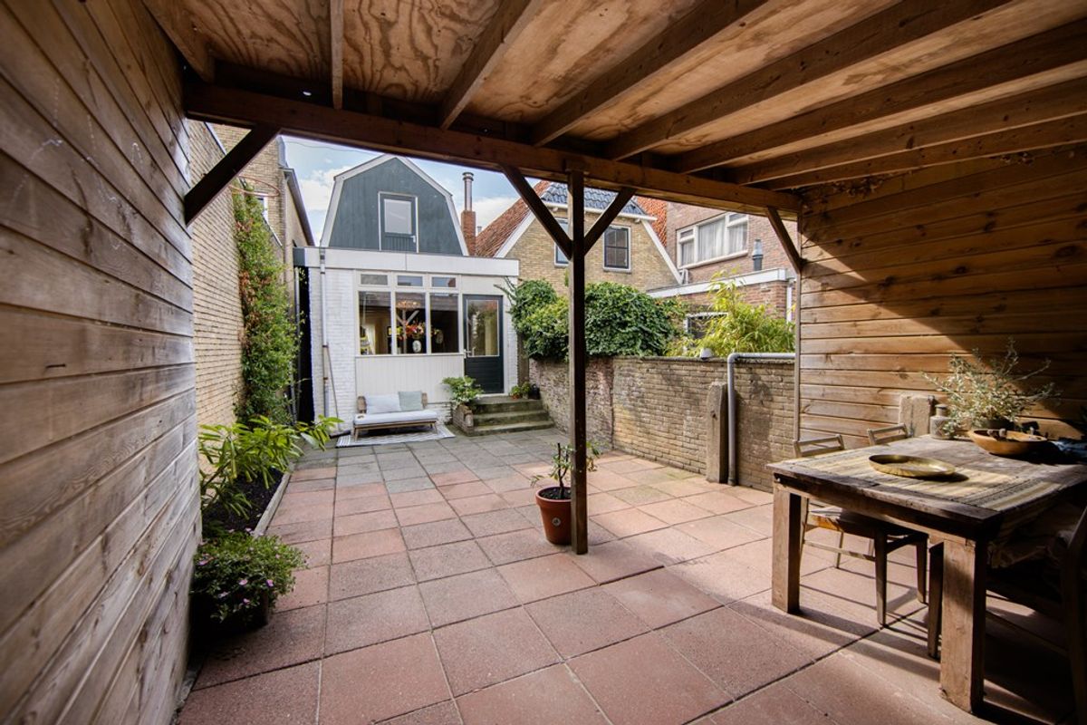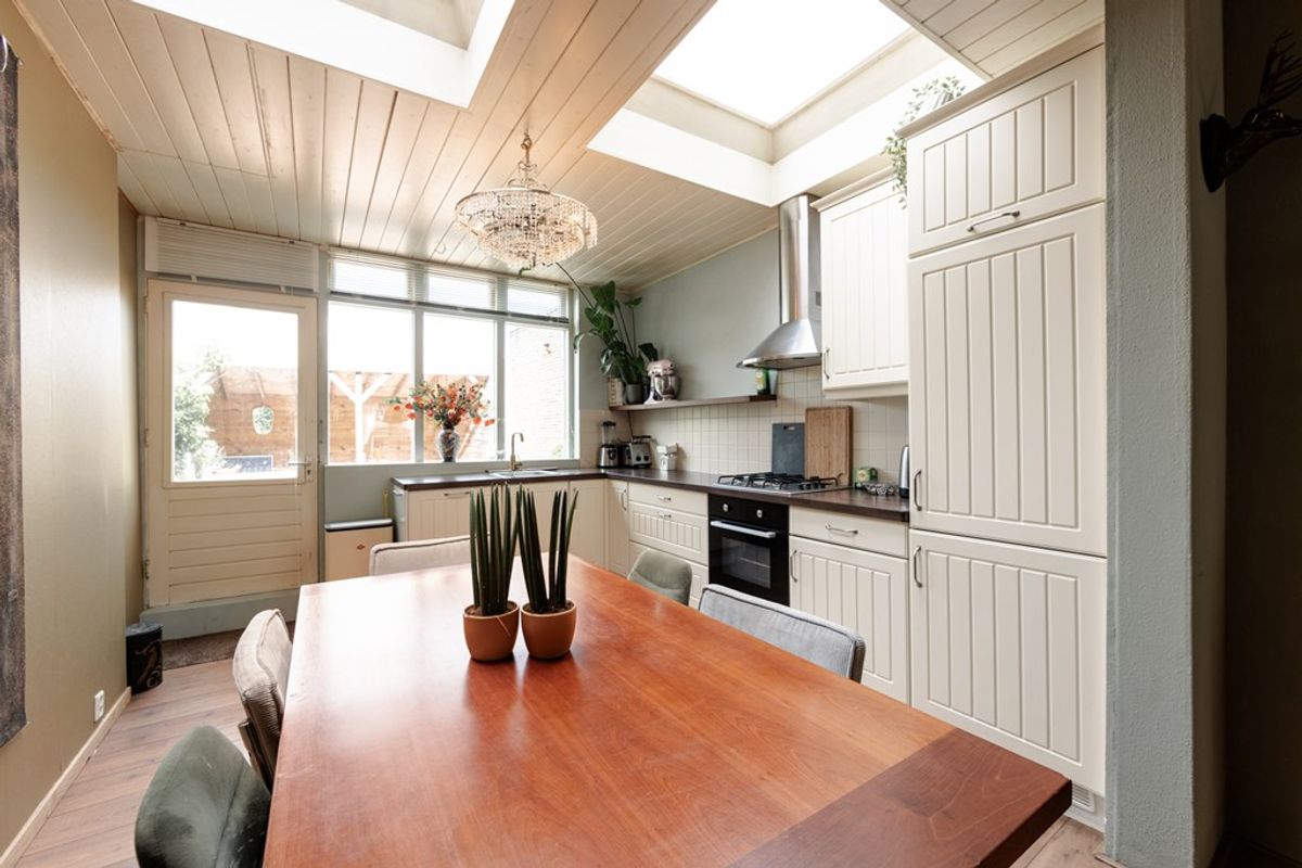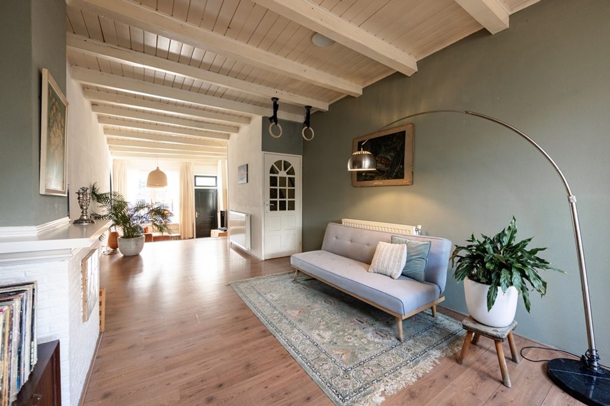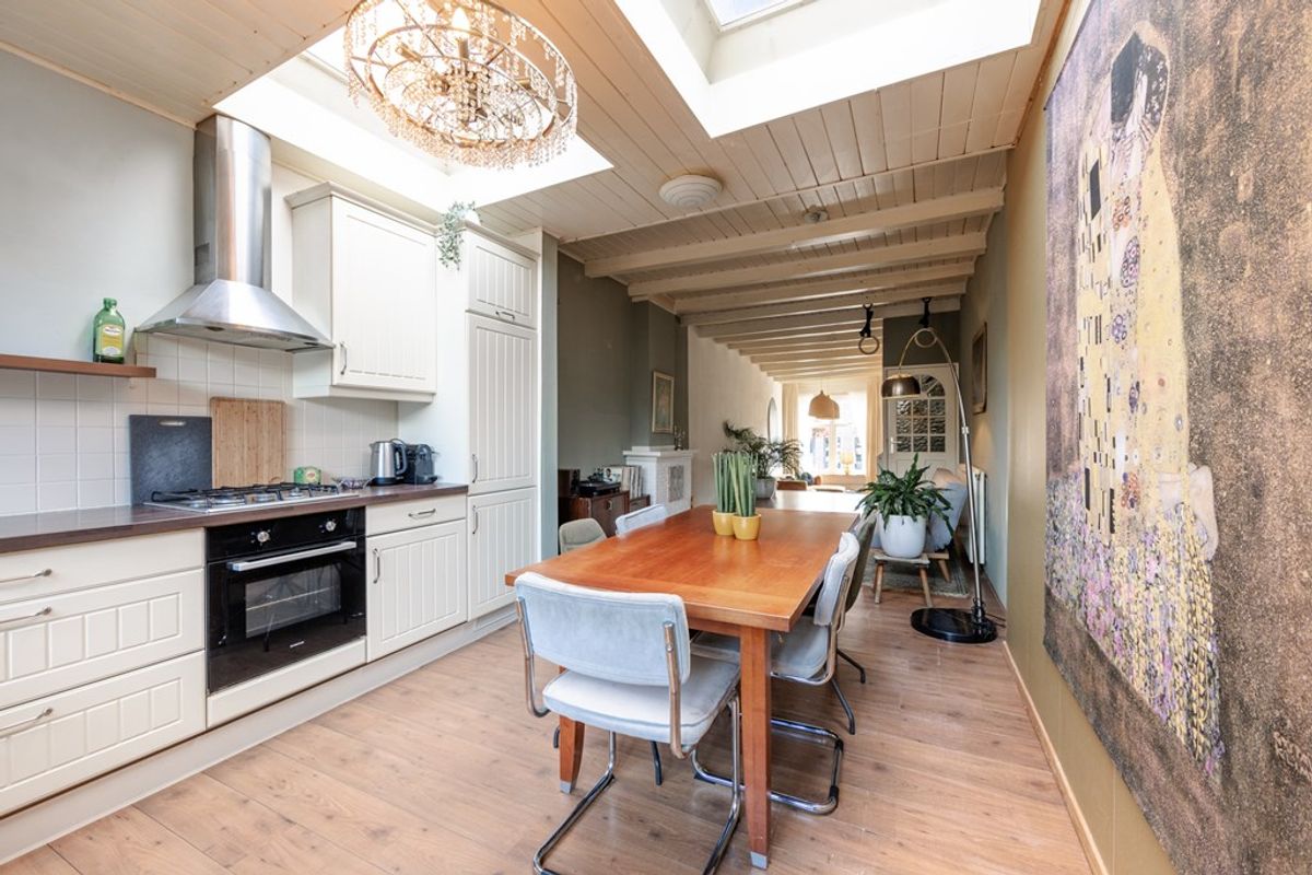 De sfeervolle woonkamer heeft een hoog balkenplafond en een opstap naar de woonkeuken. Die maar liefst 5 meter is uitgebouwd en voorzien is van lichtkoepels. In de 9 meter diepe achtertuin met overkapping kun je heerlijk van de zon genieten.