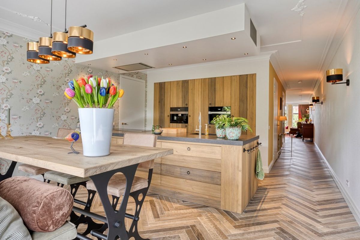 • Open keuken: schitterde op maat gemaakte exclusieve keuken met kookeiland en complete inrichting, vele lades, kastjes, een natuurstenen werkblad en geïntegreerde apparatuur zoals o.a.: combimagnetron, inductiekookplaat met afzuigkap, quooker, vaatwasser, extra grote koelkast, vriezer en een geïntegreerd koffiezetapparaat. Ook hier langs het plafons gips-sierlijsten. Via de keuken toegang tot het balkon