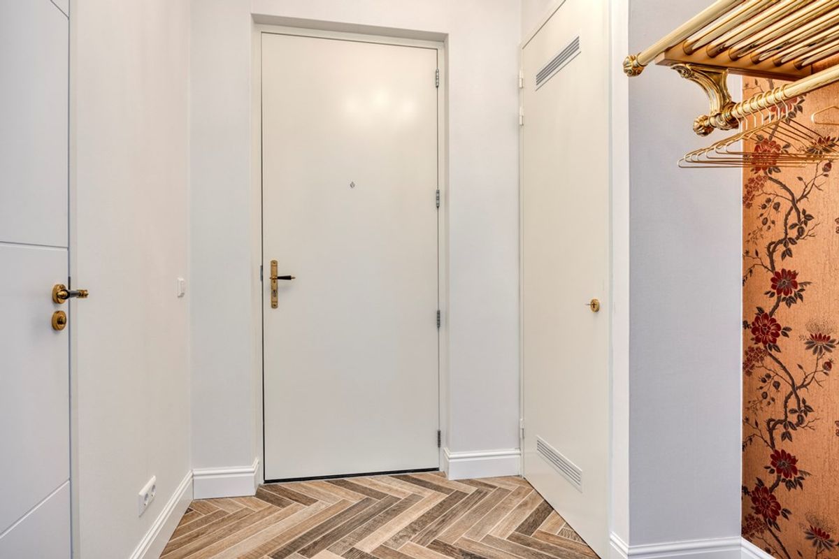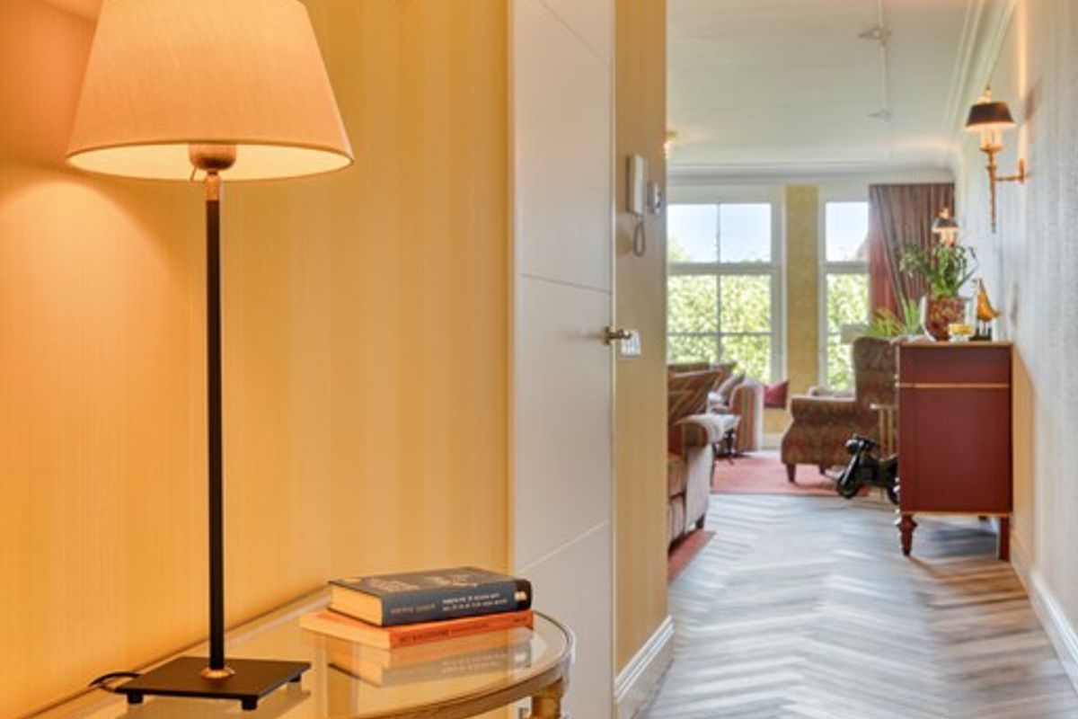 • Entree: bereikbaar via trappenhuis of lift. Hierachter de ontvangsthal met garderobe, toiletruimte en meterkast. In de hal een fraaie keramisch, in visgraad gelegde keramische vloertegel die doorloopt over de gehele begane grond m.u.v. de slaapkamers en de gang tussen de slaapkamers. Hier ligt tapijt.