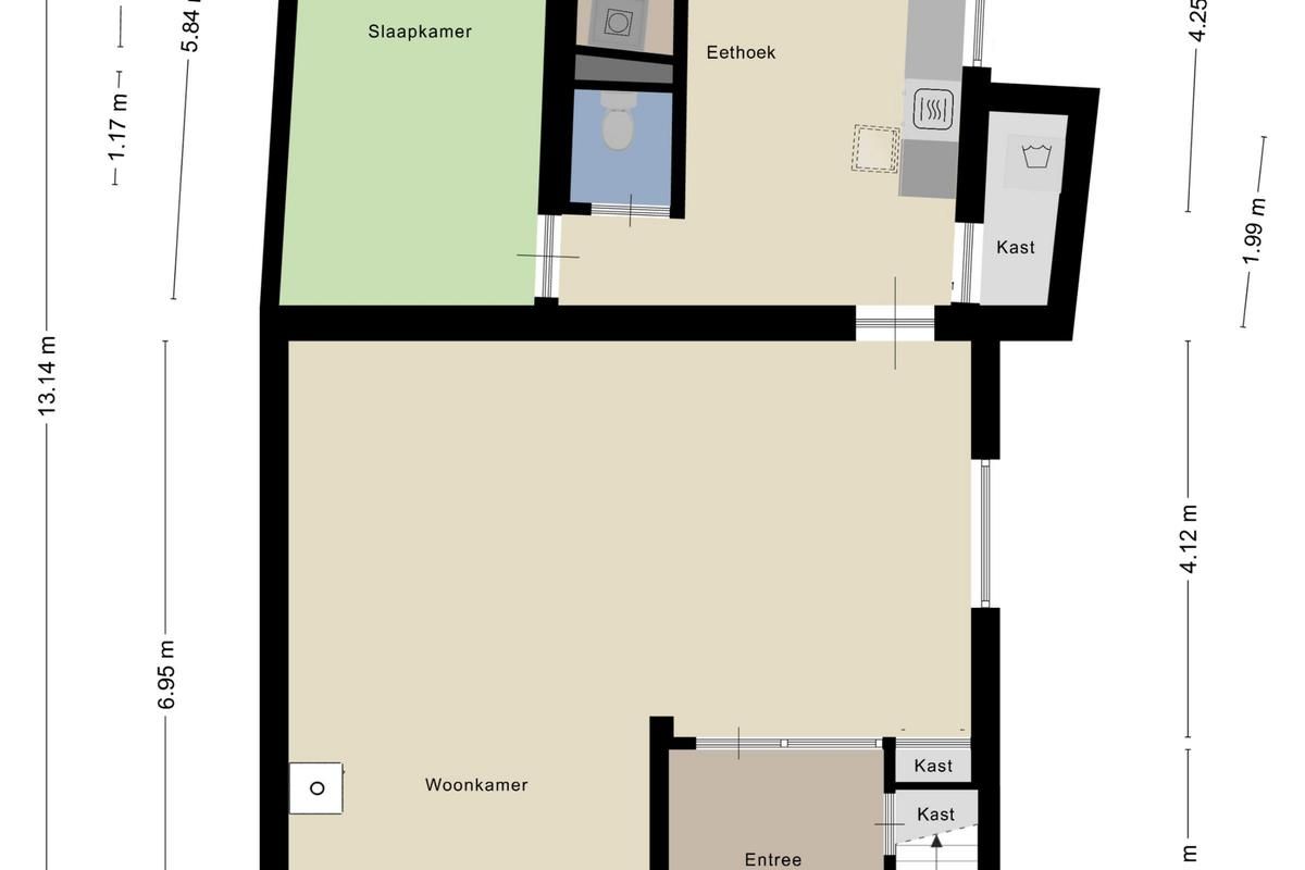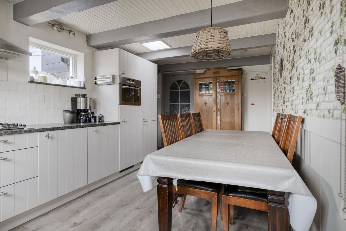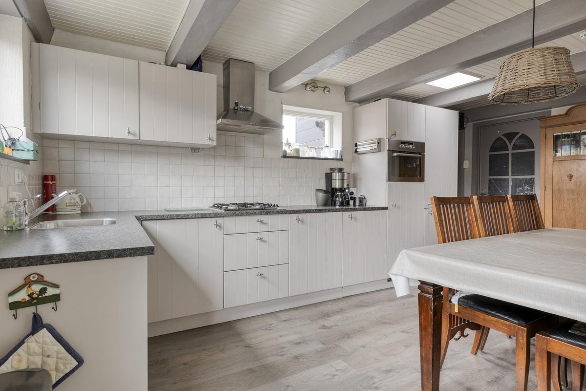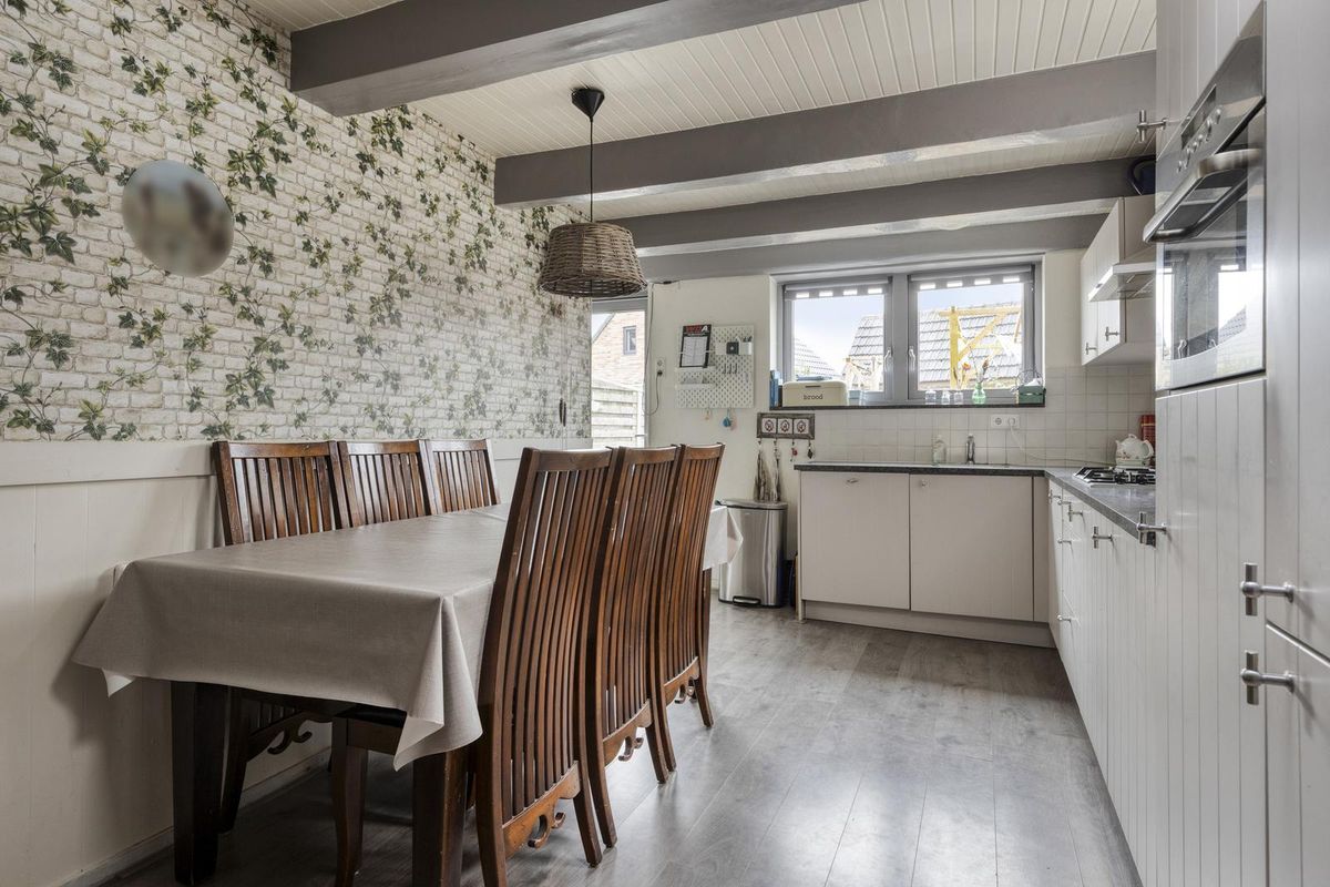 Aansluitend vind je de woonkeuken. Deze is royaal van opzet en ingericht in een praktische hoekopstelling met diverse inbouwapparatuur: een koelkast, vriezer, vaatwasser, spoelbak, afzuigkap en gaskomfoor. De keuken biedt ruimte voor een eettafel waar je gezellig kunt eten met familie of vrienden.