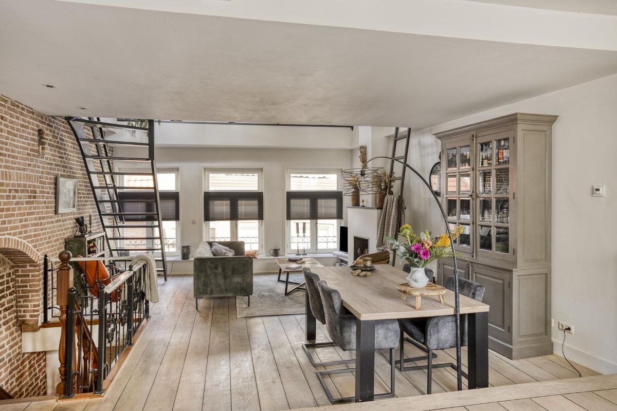 Denk aan een originele stadsmuur in de woonkamer, hoge plafonds tot in de nok, een vide met werkplek en een dakterras waar je nipt van een wijntje met het geroezemoes van de binnenstad op de achtergrond.