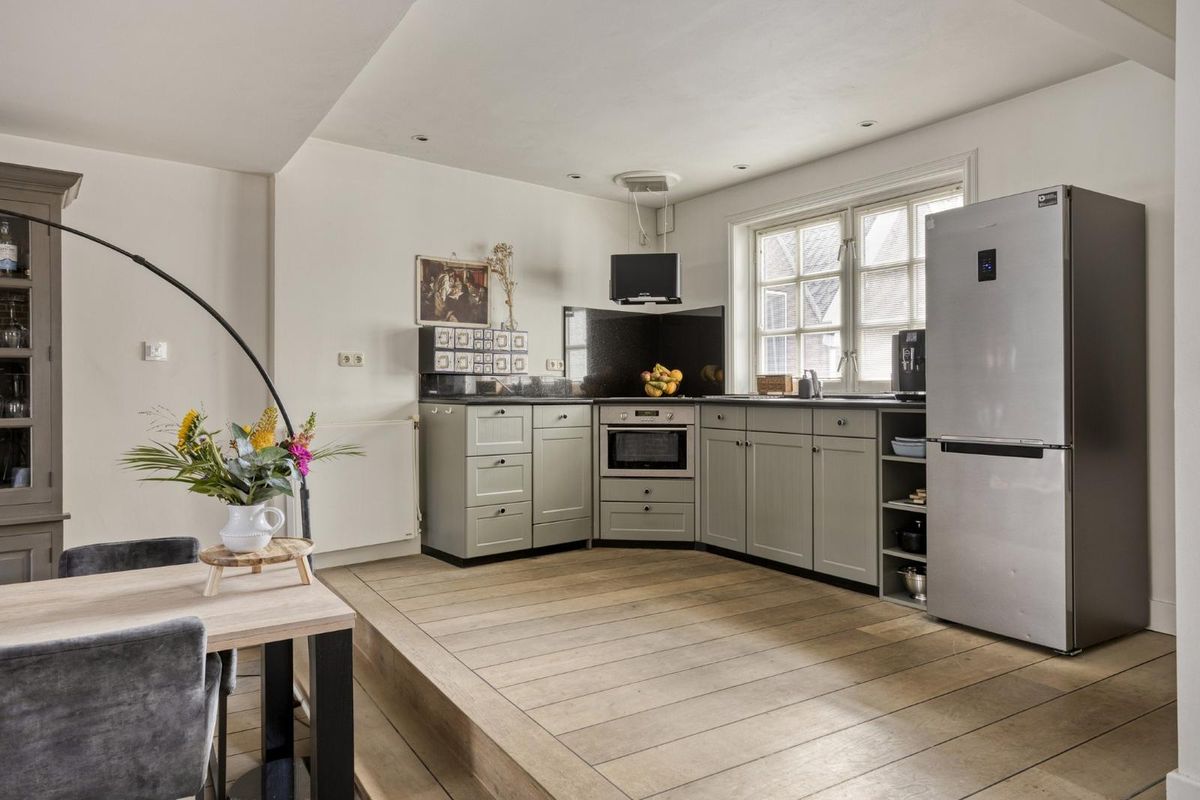Hier ontvouwt zich een lichte woonkamer met open keuken, waar de originele stadsmuur zichtbaar is gebleven, een uniek detail dat de ruimte een bijzondere uitstraling geeft.