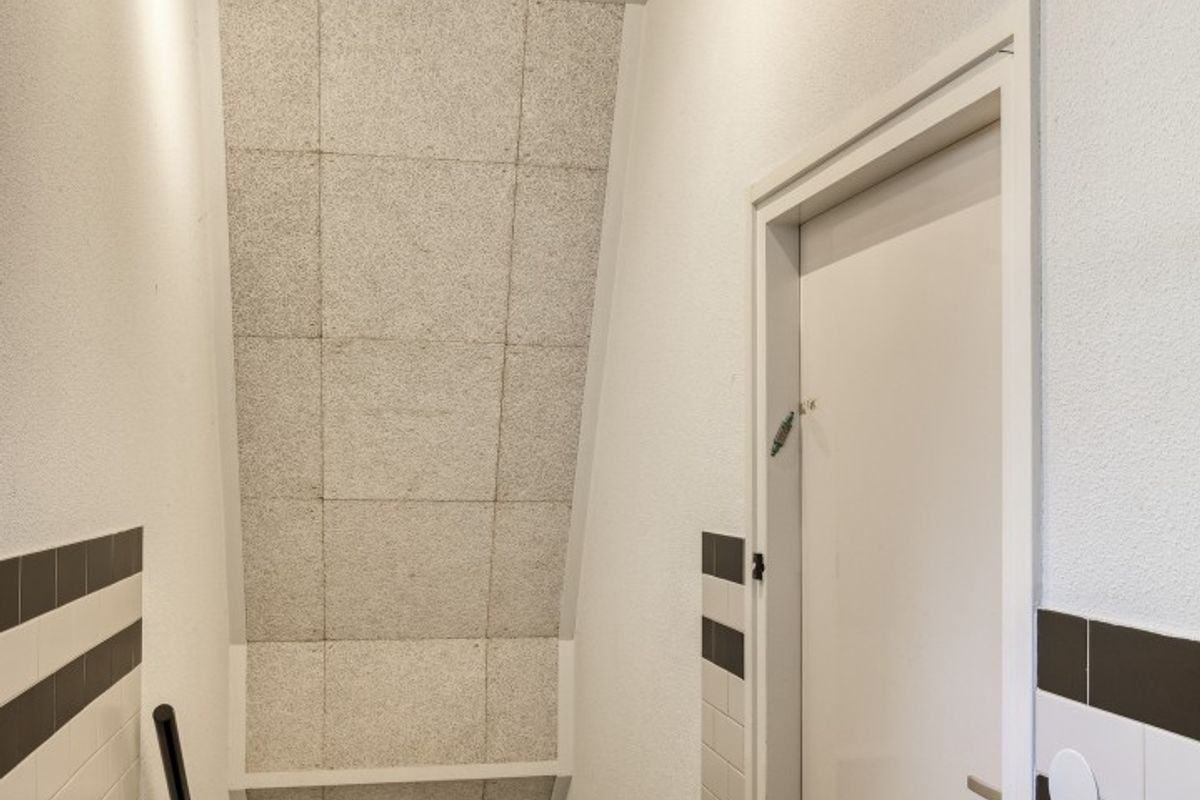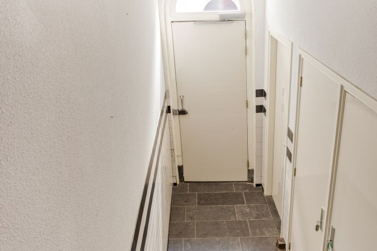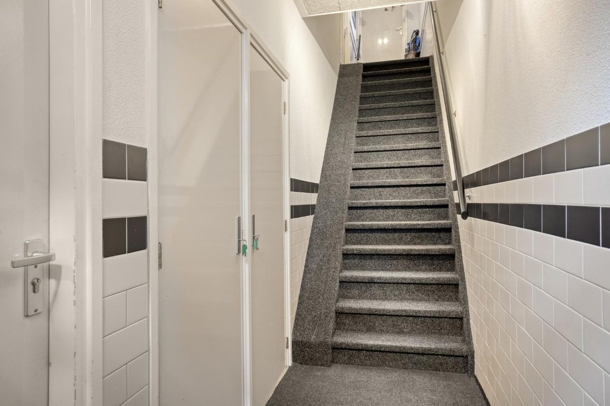 Vanuit hier leidt de trapopgang naar de eerste verdieping, waar zich de voordeur naar de woning bevindt.