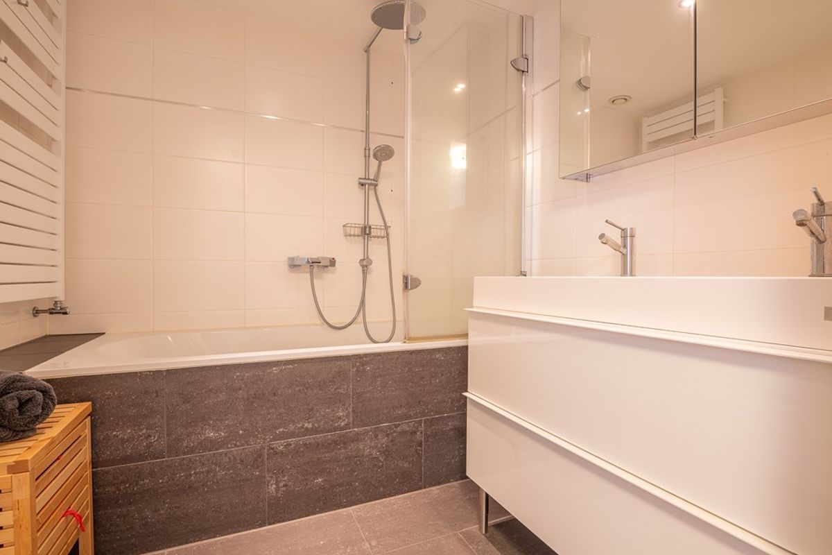 Entree op de eerste verdieping, hal, zeer ruime woonkamer, moderne open keuken (v.v. diverse inbouwapparatuur), drie ruime slaapkamers, badkamer met ligbad en dubbele wastafel, aparte toilet, bergruimte en groot terras.