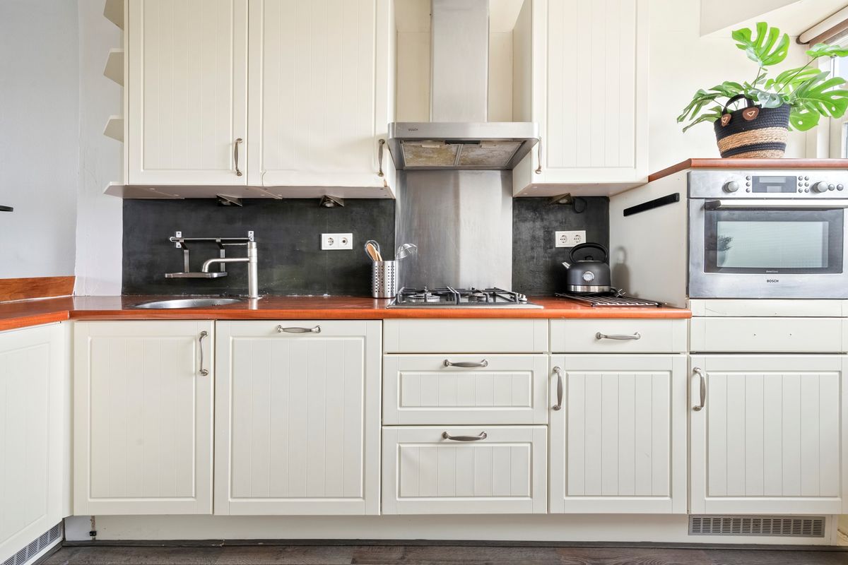 • De keuken die zichtbaar gebruikssporen heeft is voorzien van onder meer een gaskookplaat, afzuigkap, vaatwasser, koelkast met vriesvak en een oven.