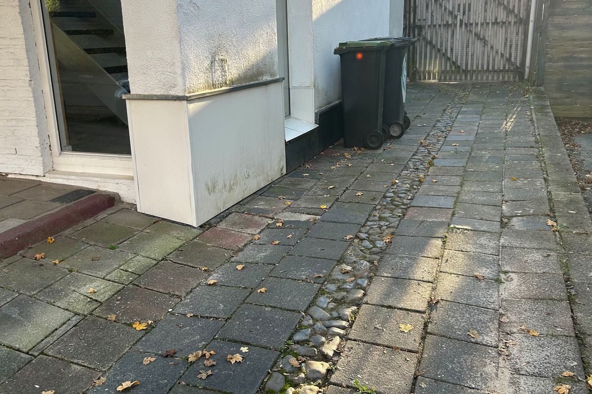 Zij-tuin is oprit voor plaatsing van meerdere auto's en doorgang naar achtertuin.
