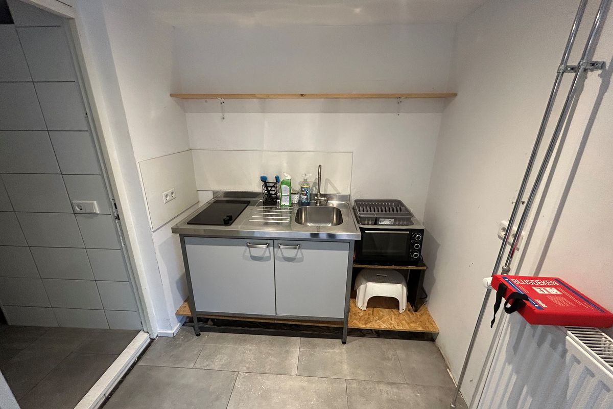 Serre 5,45 x 1,90 met plavuizenvloer, inbouwspots, openslaande deuren naar achtertuin, keukenblok en deur naar badkamer.