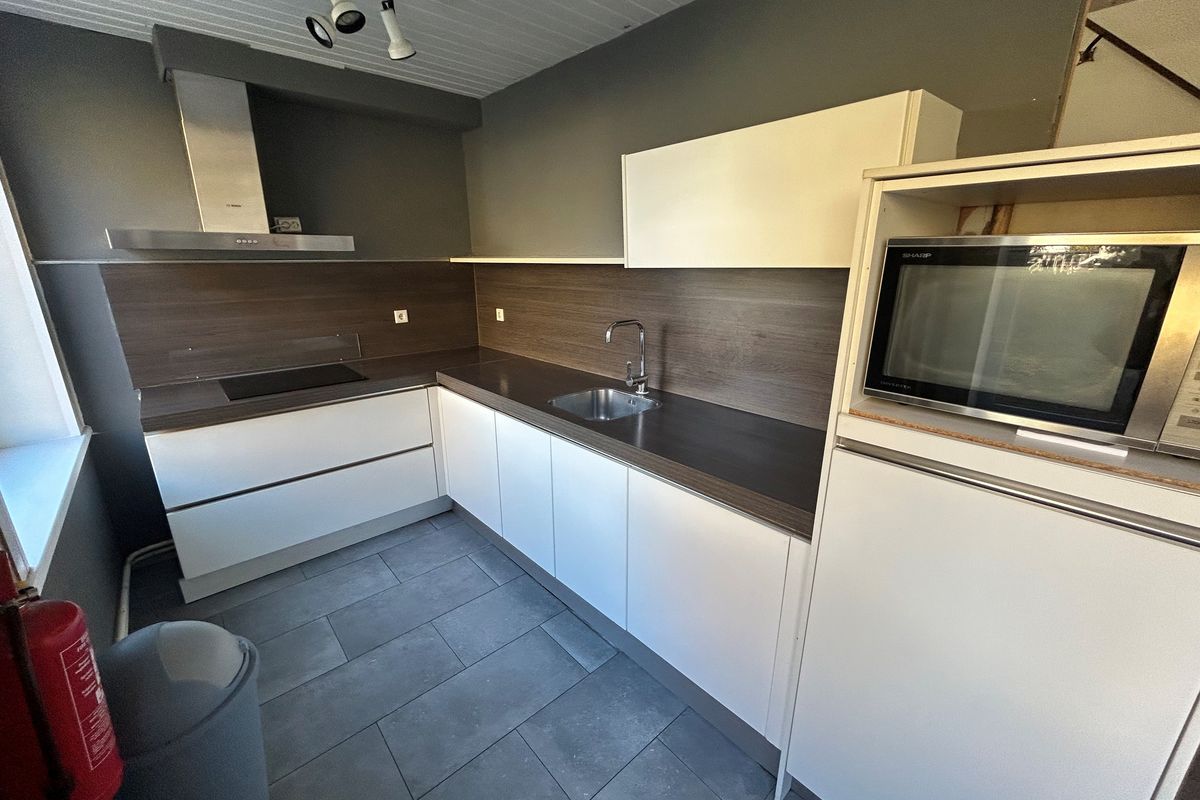 Open keuken 5,60 x 4,30/2,15 met plavuizenvloer, deur naar woonkamer en aanbouwkeuken met elektrische kookplaat met RVS-afzuigunit, vaatwasser, koelkast, magnetron en spoelbak.