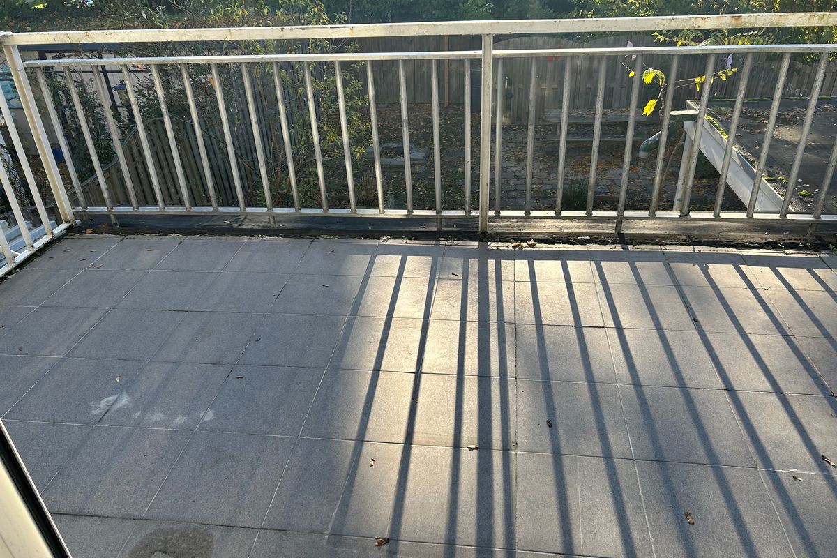 Woonkamer 5,65 x 4,05 met plavuizenvloer en deur naar grote balkon 5,75 x 2,25/0,90 met trap naar achtertuin.
