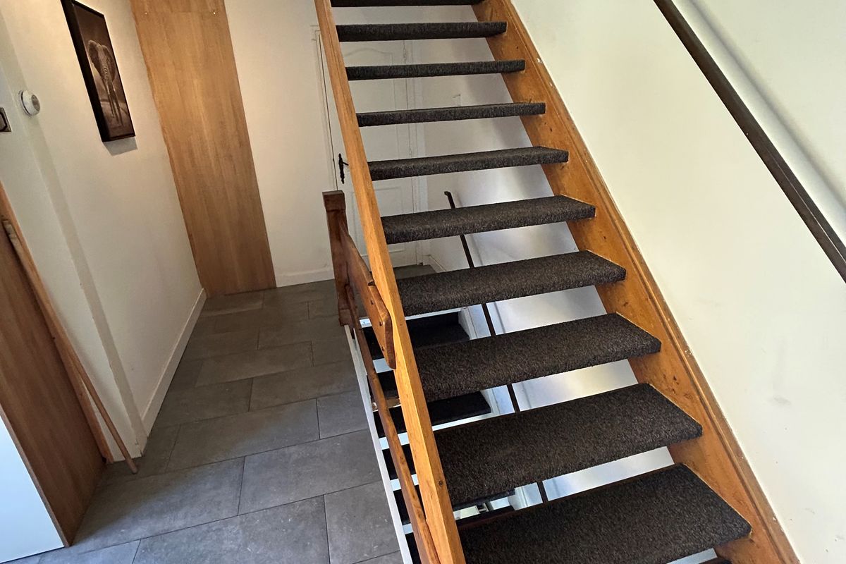 Entree/hal 3,80 x 2,20 met plavuizenvloer, deur naar slaapkamer en wasruimte en trap naar verdieping.