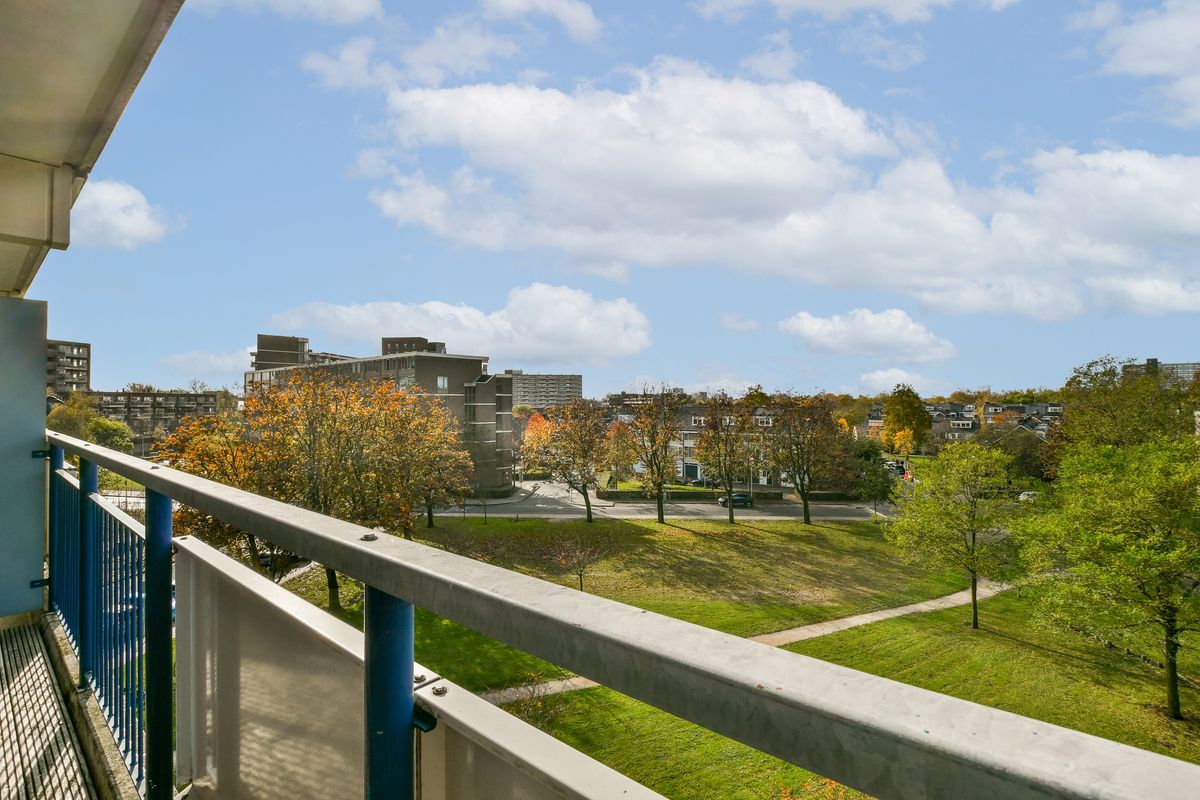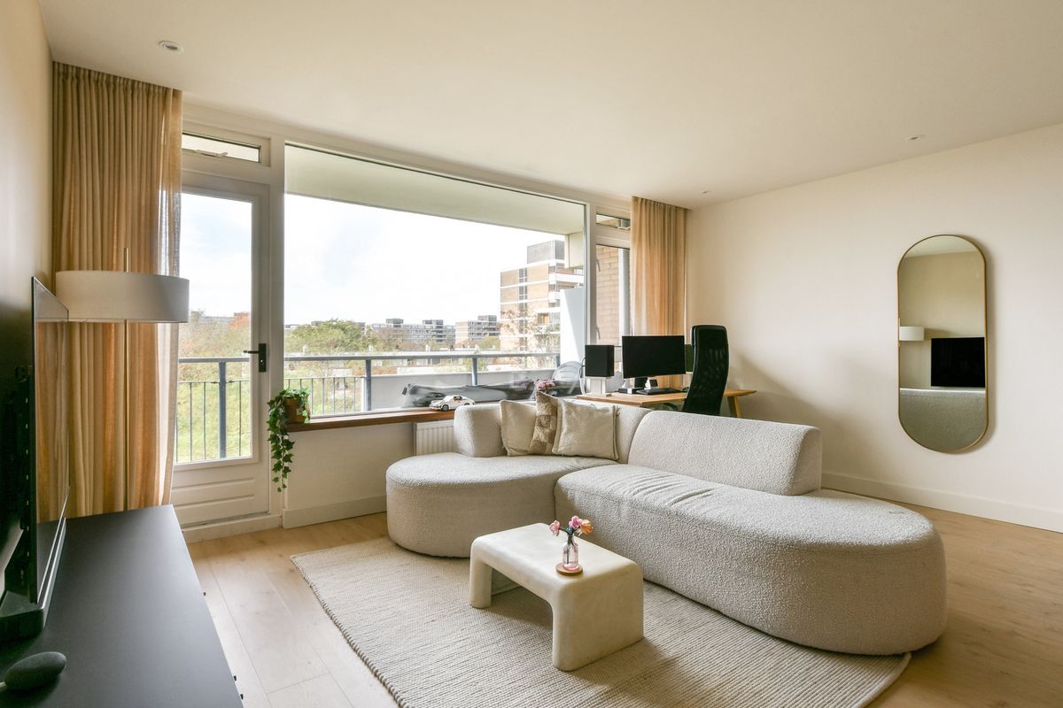 Ruime woonkamer met fantastisch vrij uitzicht en een balkon over de complete breedte van het appartement.