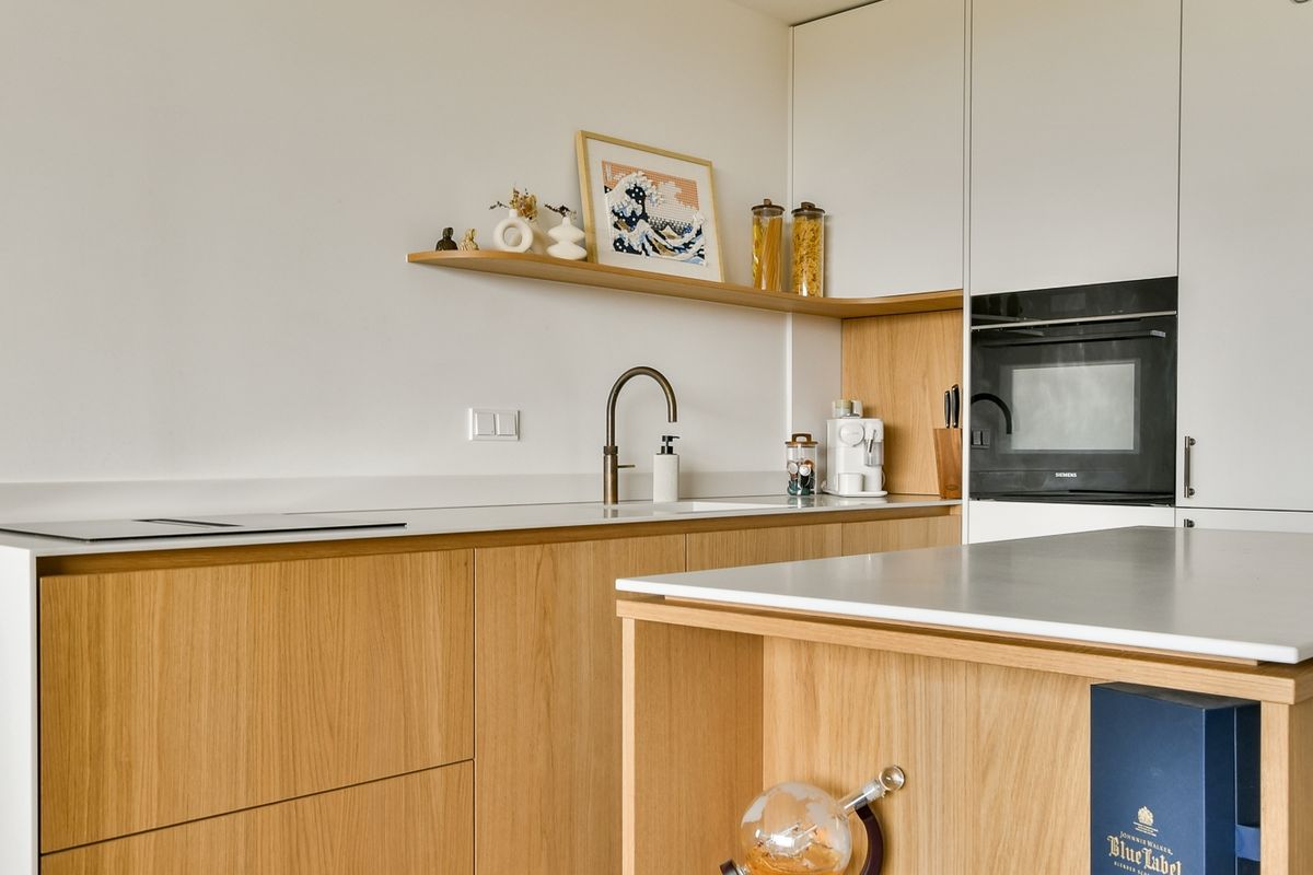 De luxueuze open keuken is uitgerust met een elektrisch fornuis en kookeiland en is van alle gemakken voorzien. In de lange kastenwand met veel opbergmogelijkheden met een ingebouwde wasmachine is eveneens een kaptafel ingebouwd.