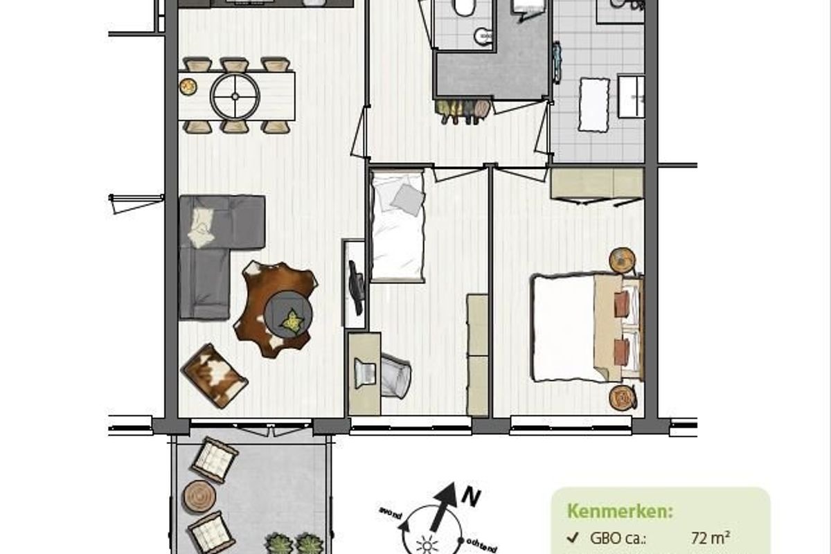2e verdieping: Entree van het appartement. Woonkamer met open keuken, voorzien van inbouwapparatuur zoals een vaatwasser, combi-oven, koelkast met klein vriesvak en kookplaat met afzuigkap. Badkamer met douche en wastafel met spiegel. Het appartement beschikt over twee ruim bemeten slaapkamers, ideaal als slaapvertrek, thuiskantoor of logeerkamer. Daarnaast is er een aparte berging voor extra gemak.