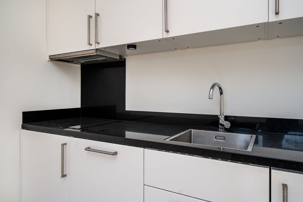 De keuken is erg netjes en voorzien van witte keukenkasten met een zwart natuurstenen aanrechtblad. De keuken beschikt over inbouwapparatuur.