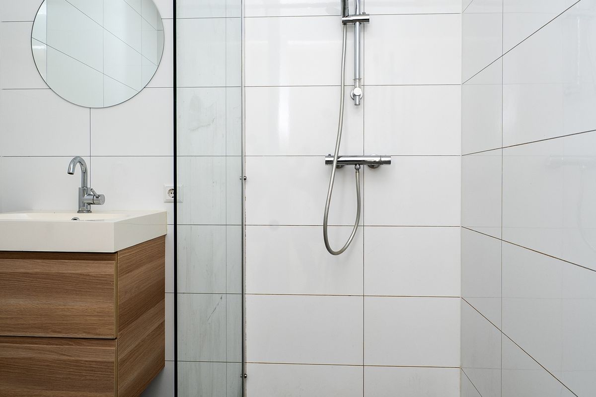 De luxe badkamer beschikt over een inloopdouche met glazen wand en een wastafel met meubel. De grote witte wandtegels in combinatie met de grote donkergrijze vloertegels geven de badkamer een luxe uitstraling.