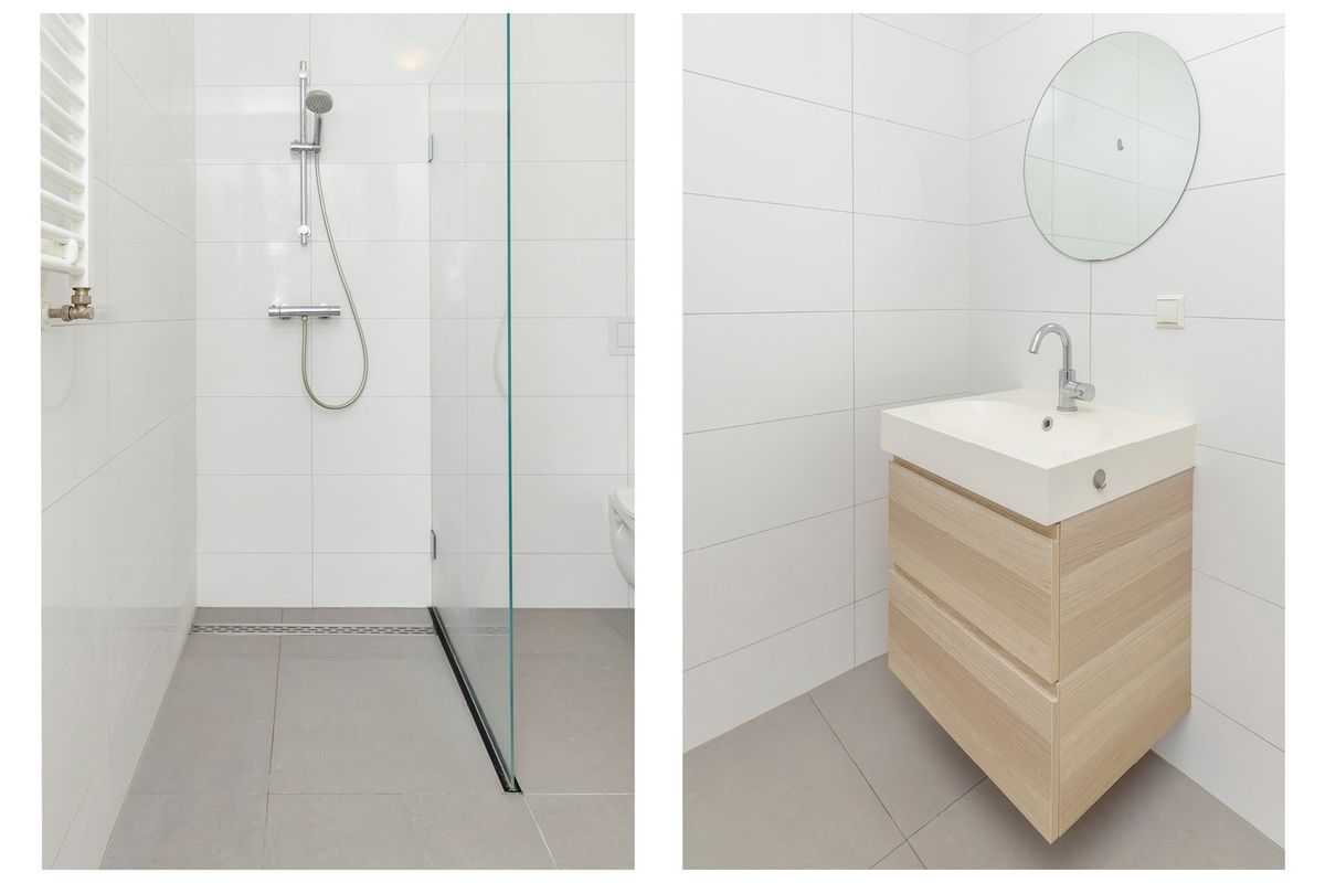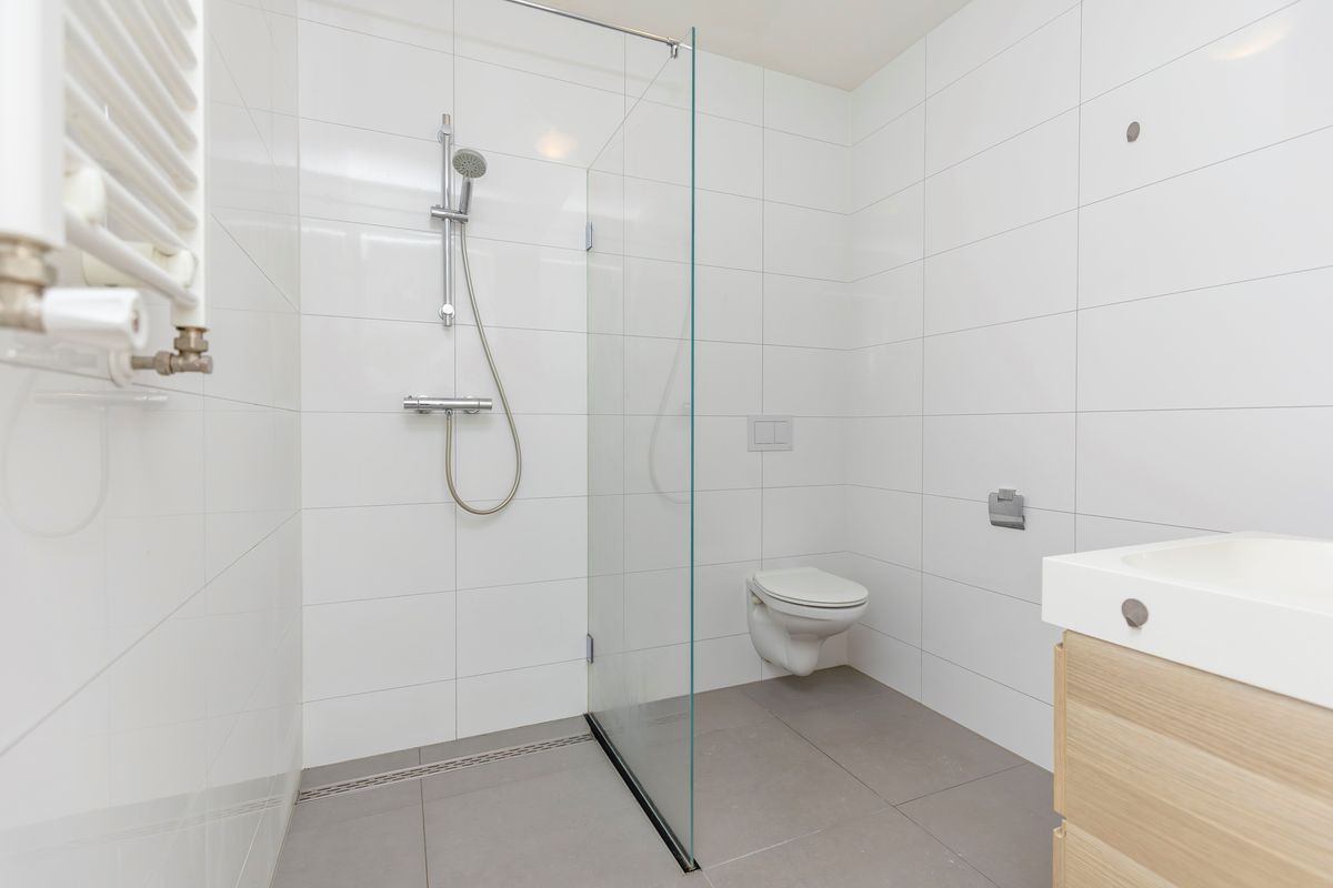 De badkamer beschikt over een inloopdouche en een wastafel met meubel, toilet en is volledig betegeld met grote wand en vloertegels. Er is nog een aparte berging met de opstelling voor de cv-ketel. Zoek niet langer, dit is een fantastische woning.