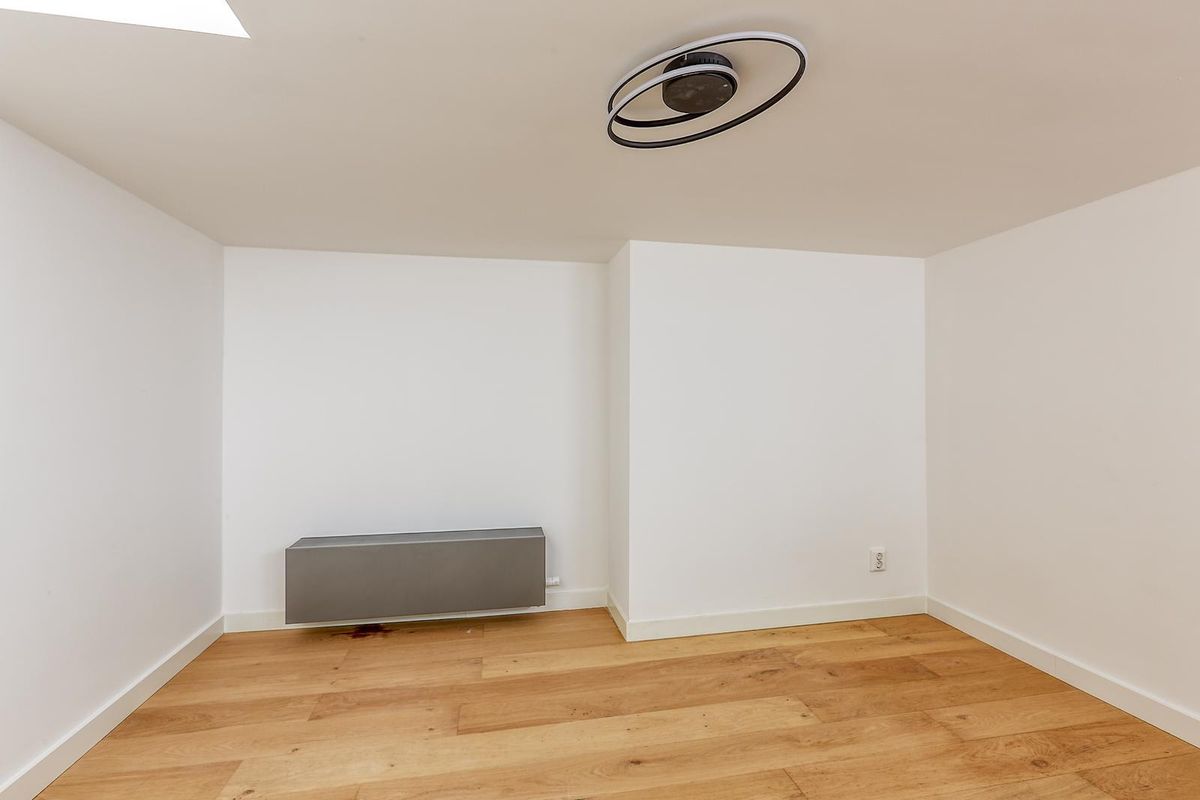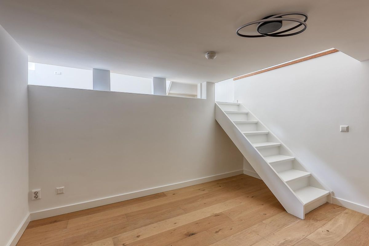 Een kleine trap vanuit de woonkamer leidt naar een extra ruimte die ideaal is als tv-kamer of thuiswerkplek.