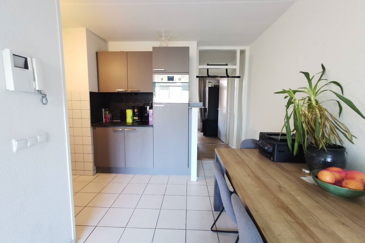 De lichte woonkamer bevindt zich aan de achterzijde en biedt toegang tot het balkon. De halfopen keuken is volledig ingericht met inbouwapparatuur: een koelkast, kookplaat, afzuigkap en vaatwasser.
