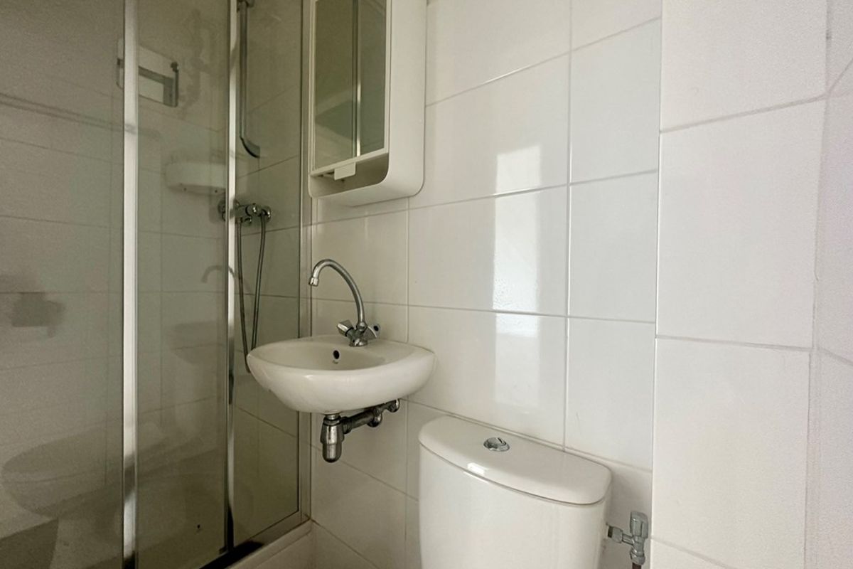 De badkamer is voorzien van een separate douche, wastafel met spiegel en toilet.