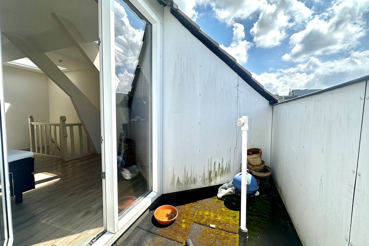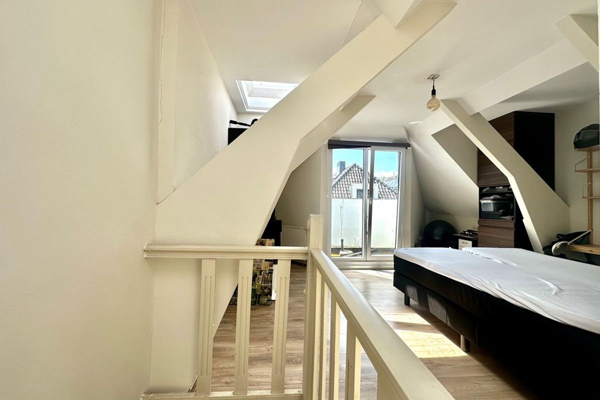 Via de trap is er toegang tot de bovenste verdieping. Hier bevindt zich een ruime slaapkamer met een deur richting het balkon aan de voorzijde van de woning.