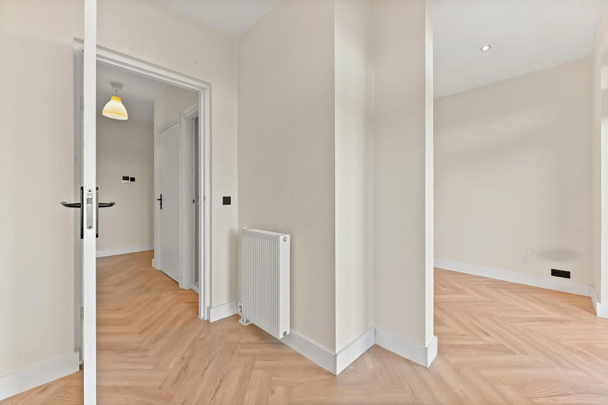 Entree van het appartement, hal met meterkast en separaat toilet. Ruime woon-/eetkamer met halfopen keuken, voorzien van diverse inbouwapparatuur. Tussengelegen badkamer met inloopdouche, wastafelmeubel en designradiator. Aan de achterzijde bevinden zich twee slaapkamers: slaapkamer I (ca. 12 m²) en slaapkamer II (ca. 11 m²), waarbij beide slaapkamers toegang bieden tot het achterbalkon. Het balkon is voorzien van twee balkonkasten.