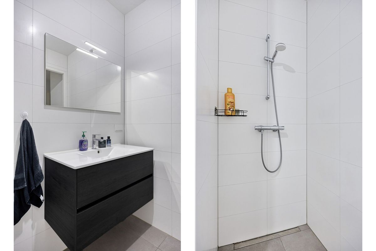 Grenzend aan de gang, naast de keuken, ligt de luxe badkamer. Deze is van vloer tot plafond betegeld en voorzien van een ruime inloopdouche, een wastafelmeubel en een toilet. De moderne afwerking en praktische indeling maken dit tot een prettige ruimte om je dag fris te beginnen of juist ontspannen af te sluiten.