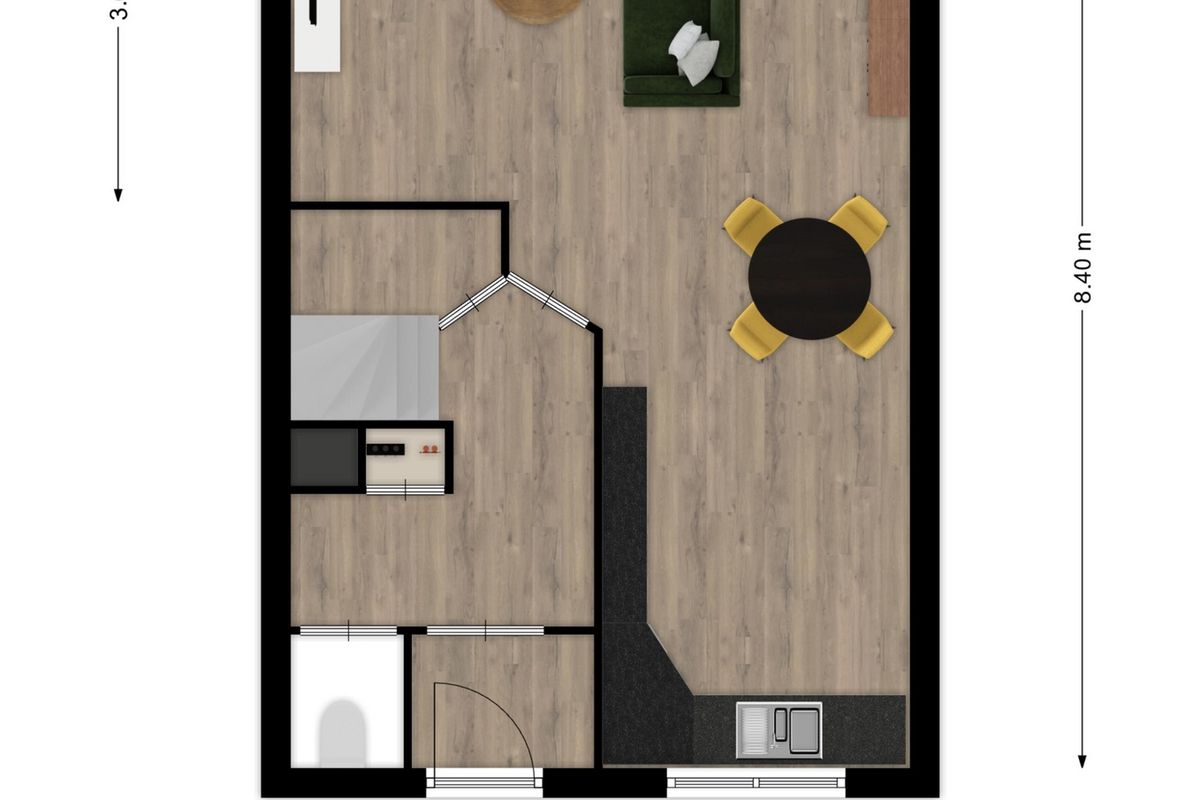 Via de voortuin, waar zich ook de stenen berging bevindt, kom je binnen in de woning. In de hal bevinden zich de meterkast, het toilet en de trapopgang. Vanuit hier stap je de ruime, lichte woonkamer binnen.
