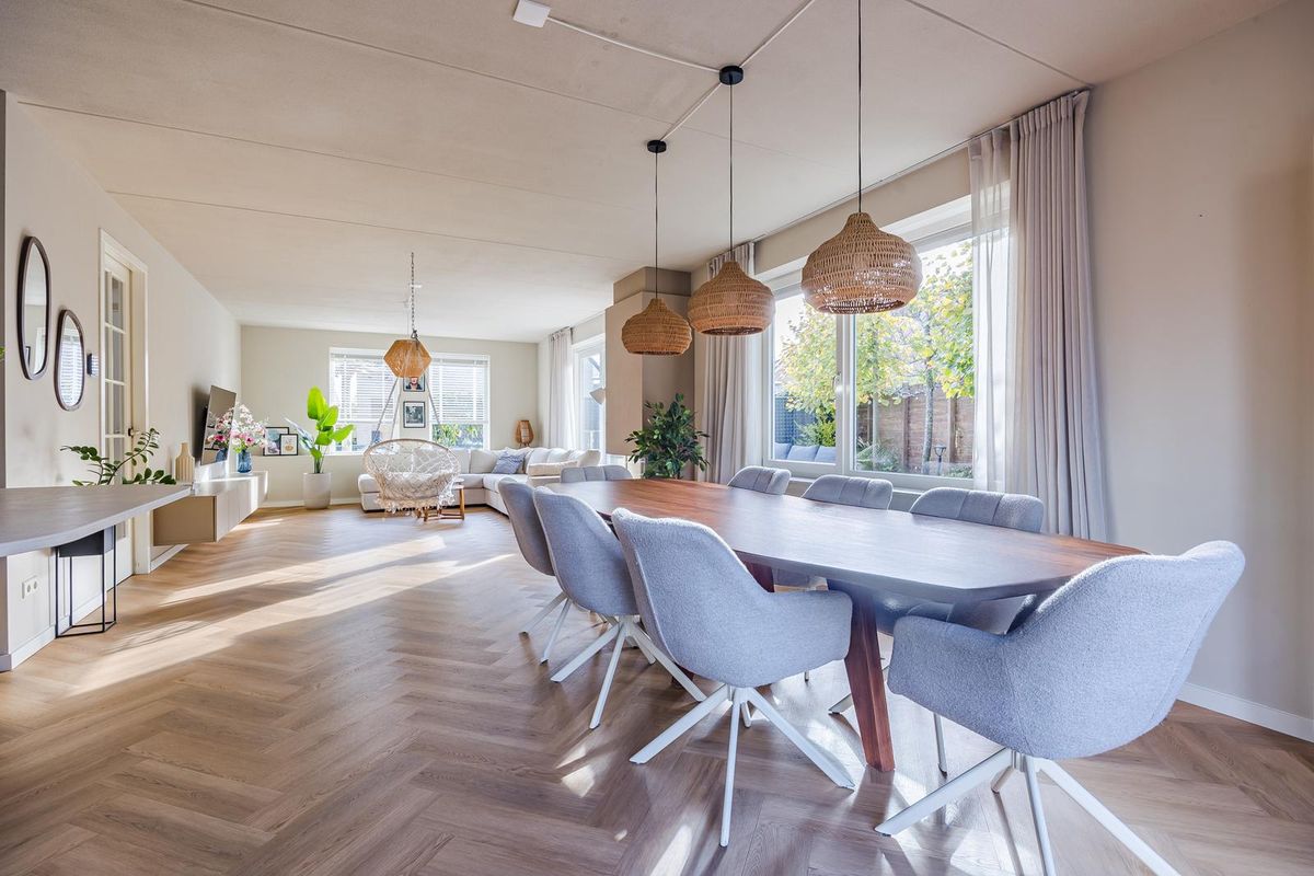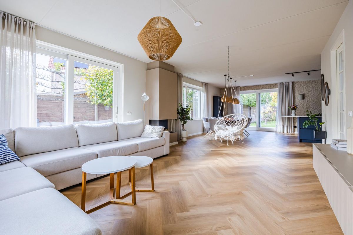 De bijzonder ruime woonkamer met visgraat pvc vloer, gestucte wanden en gezellige schouw met gashaard heeft veel lichtinval door de raampartijen en de 2 grote schuifpuien. Via de schuifpuien heeft u toegang tot het terras aan de zijkant van de woning of tot het terras aan de achterzijde van de woning.