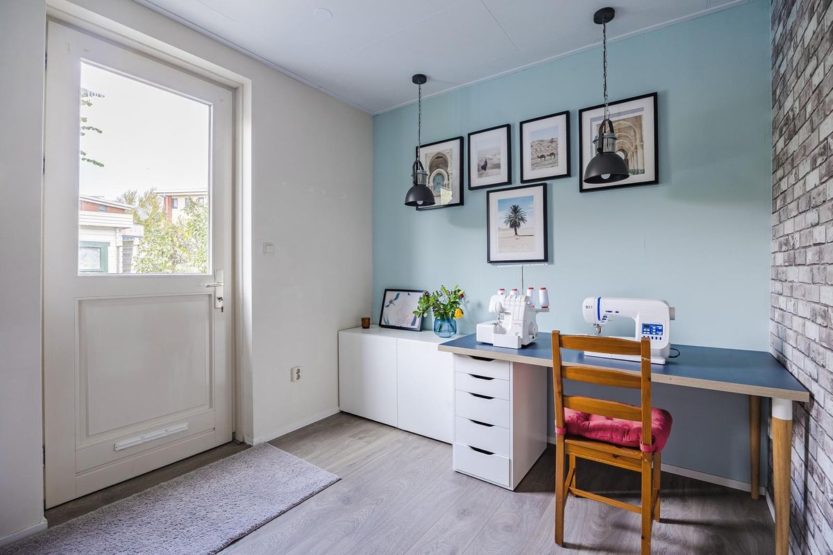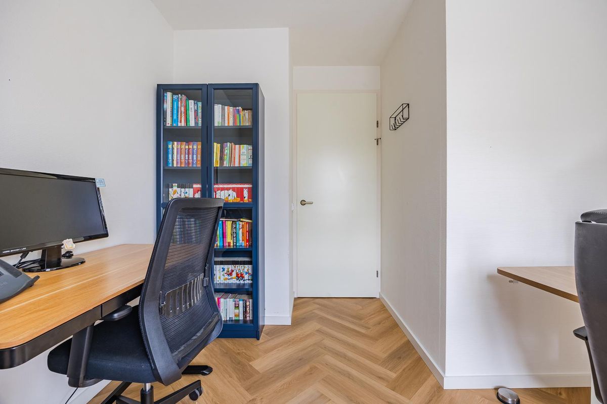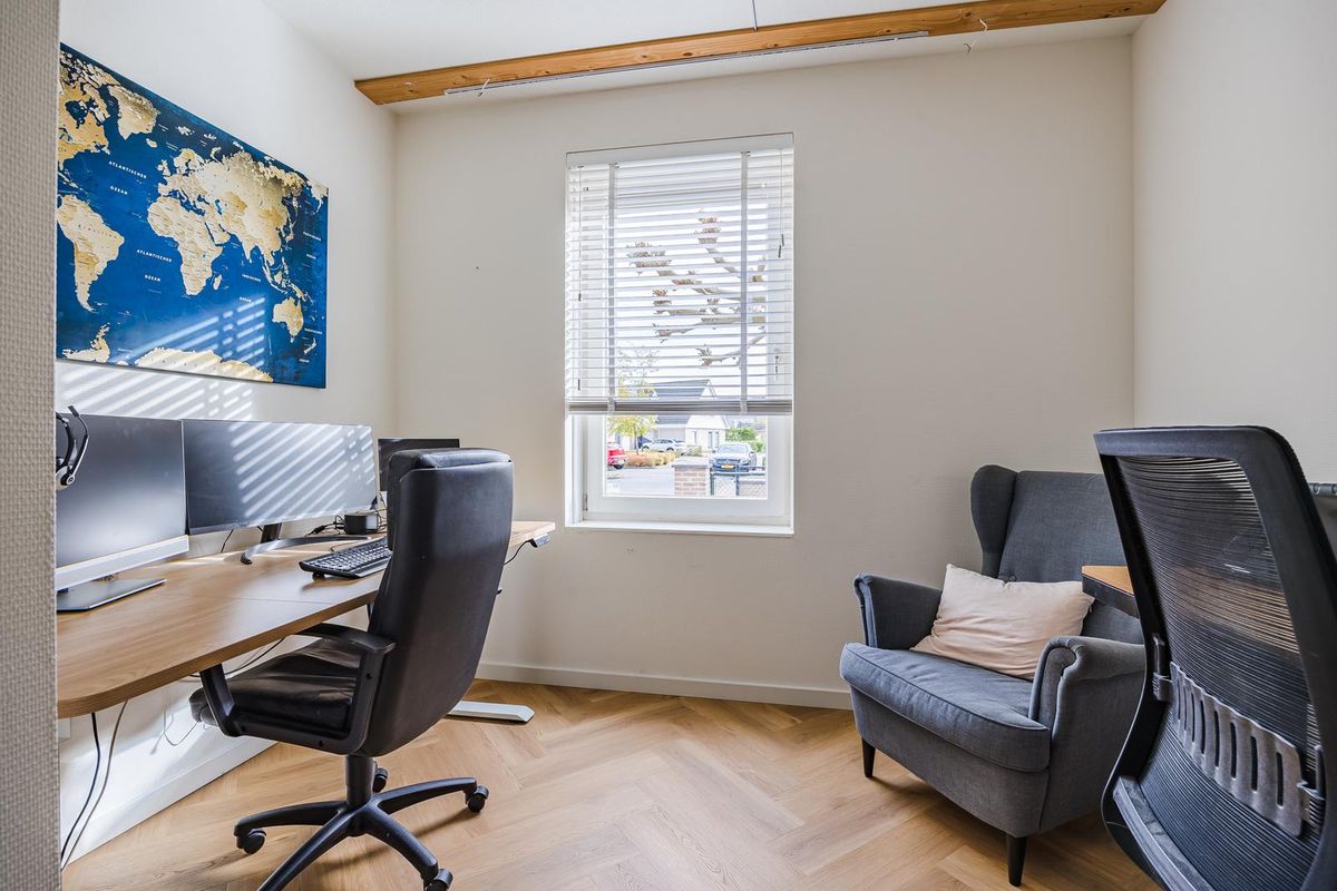 Via de garage heeft u toegang tot het kantoor. Deze is voorzien van een laminaatvloer. Vanuit het kantoor heeft u toegang tot de achtertuin.