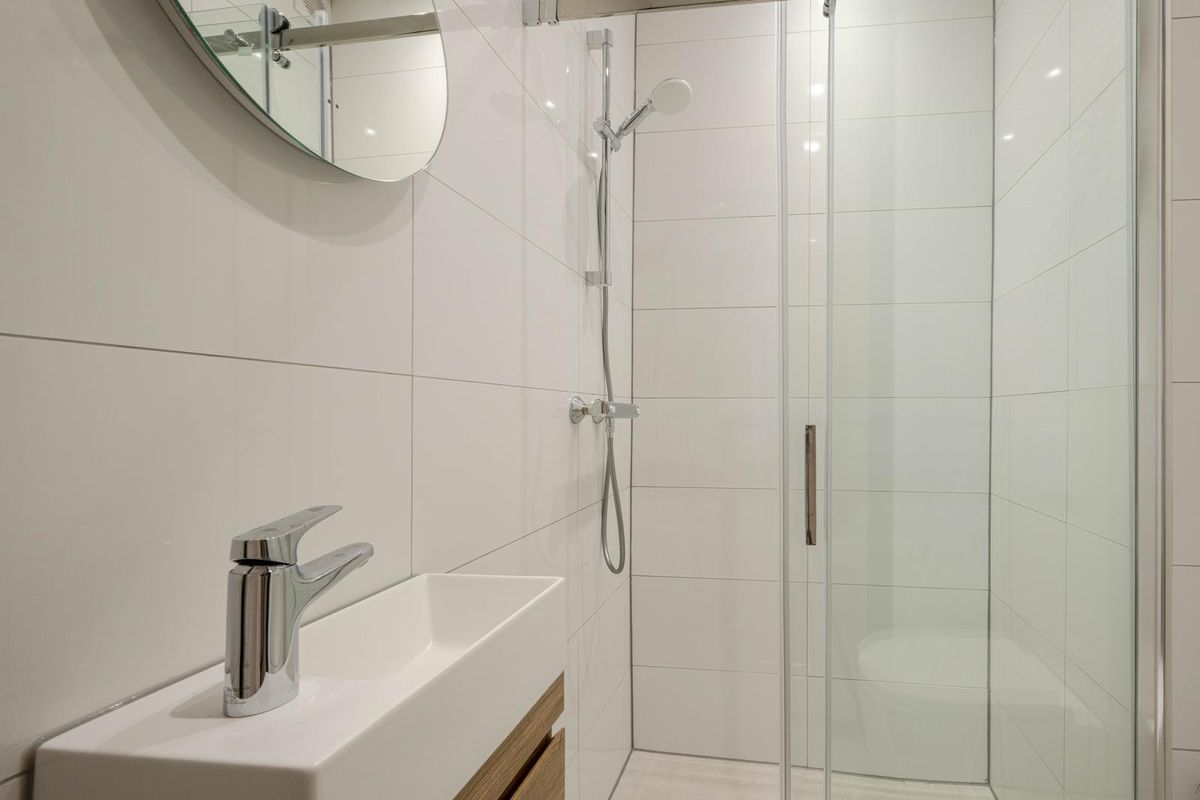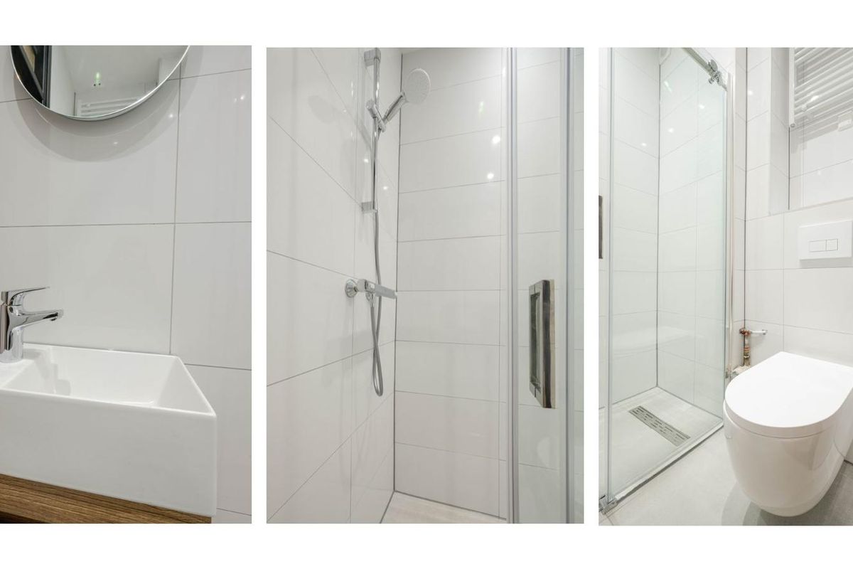 * Stijlvolle badkamer voorzien van inloopdouche, wastafelmeubel, wandtoilet, designradiator en geheel licht betegeld.