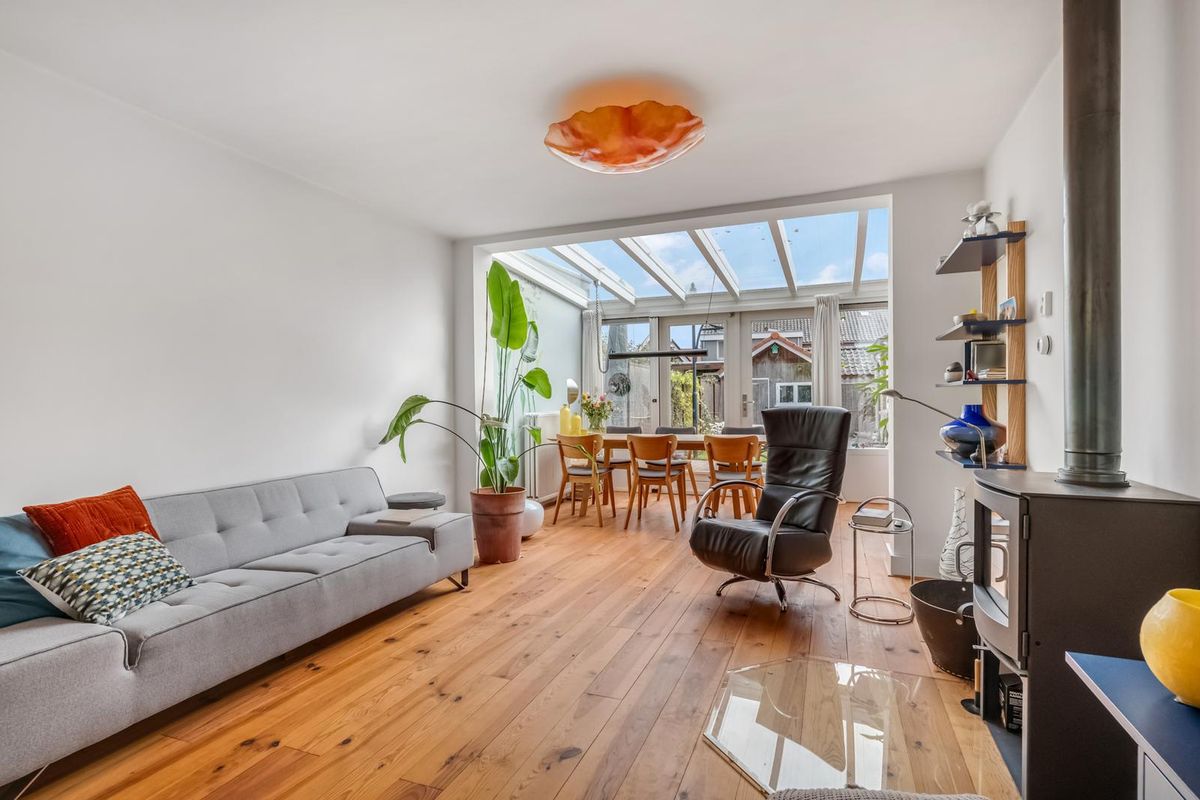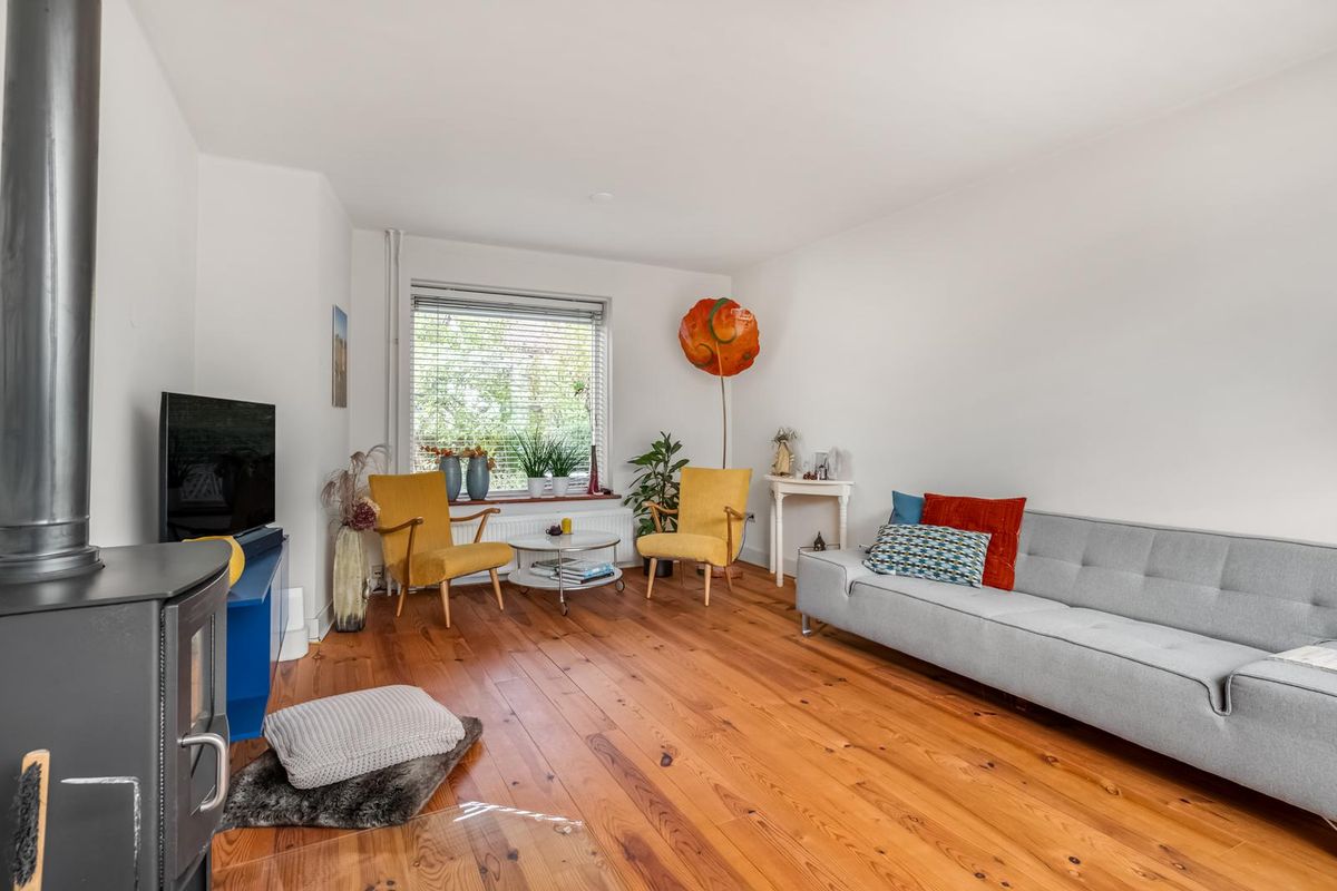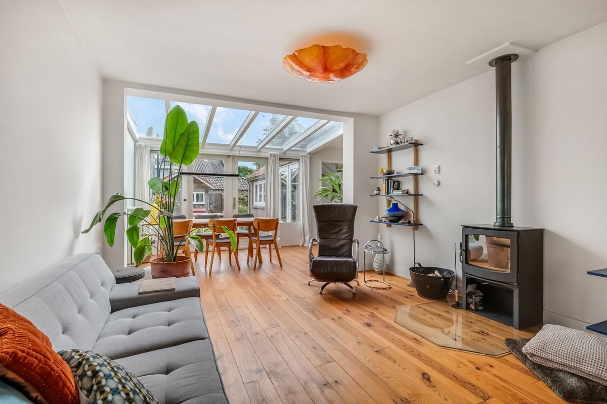 Binnenkomen voelt hier direct goed. De woonkamer is licht en sfeervol, met een houten vloer die warmte uitstraalt. De houtkachel zorgt voor knusse avonden in de winter, terwijl je ’s zomers juist de openslaande deuren van de serre openzet voor een frisse bries. Een ruimte waar geleefd mag worden – of je nu op de bank ploft met een boek, de kinderen laat spelen of vrienden ontvangt voor een borrel.