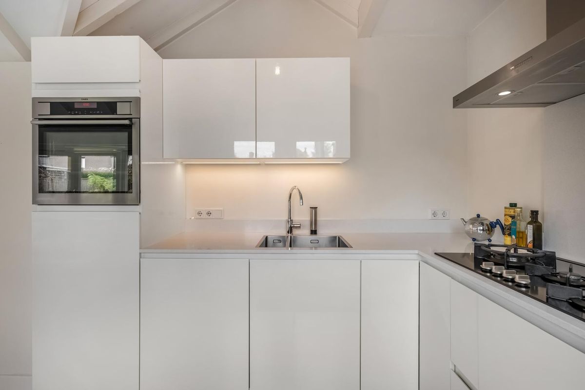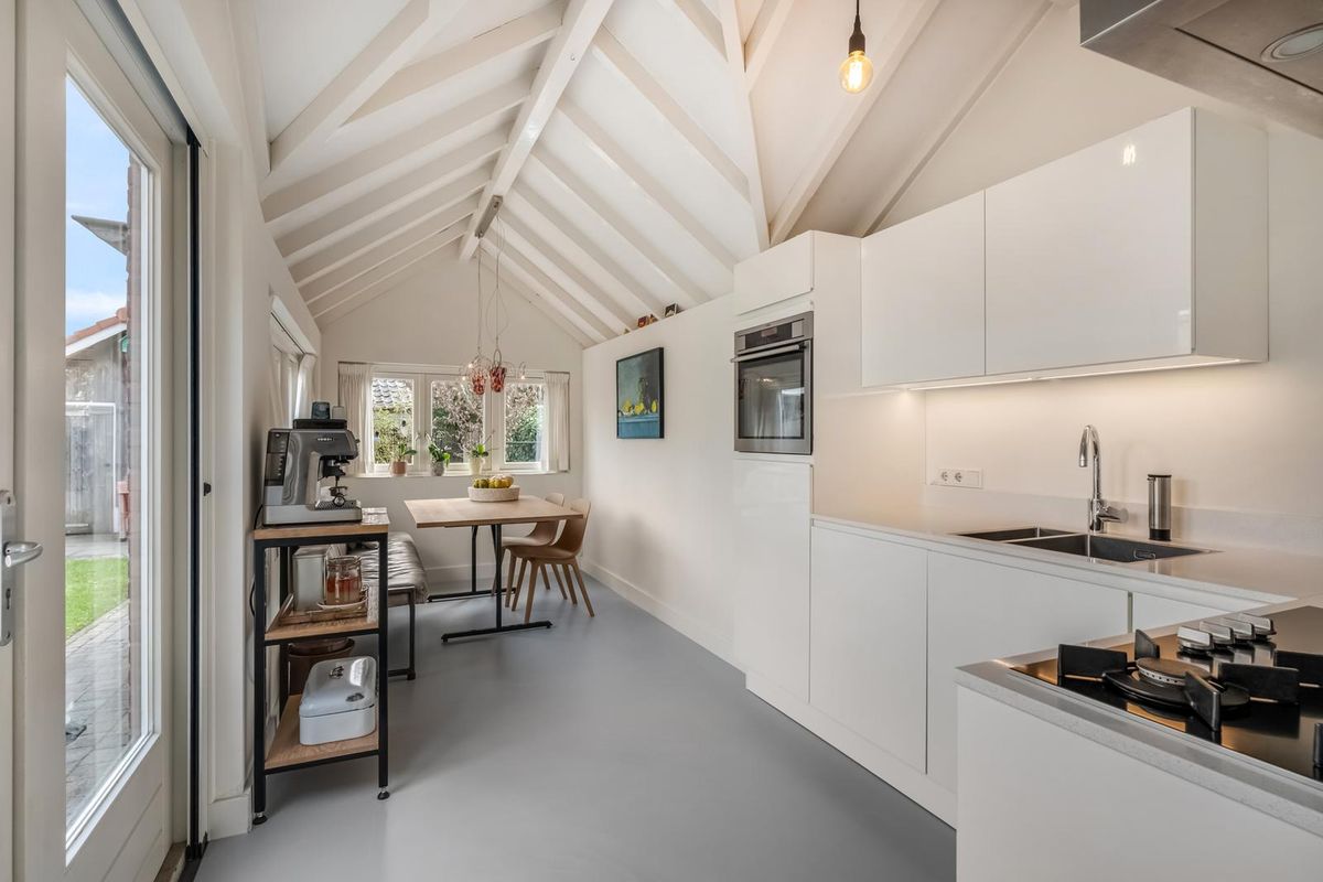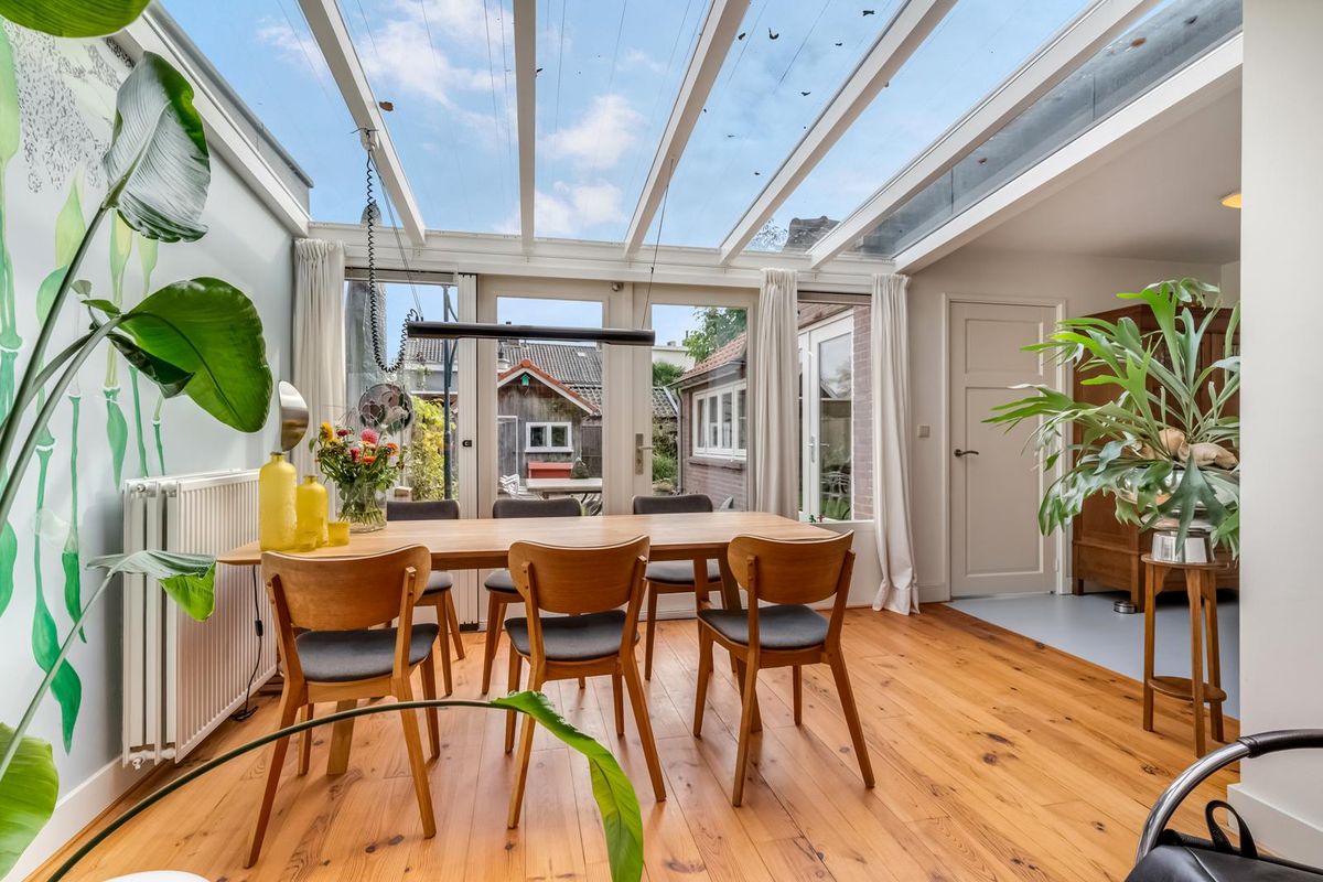 De serre aan de achterzijde is een echte bonus. Door het glazen dak valt hier de hele dag het zonlicht naar binnen. Perfect als eetkamer, werkplek of chillruimte – net wat jij nodig hebt. Direct ernaast ligt de moderne keuken met witte kasten en een licht werkblad. De keuken heeft veel werk- en opbergruimte en is uitgerust met luxe inbouwapparatuur, waaronder een stoomoven en een wokbrander. Praktisch én stijlvol, en je staat zó in verbinding met de rest van het huis en de tuin.
