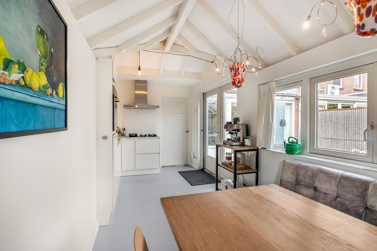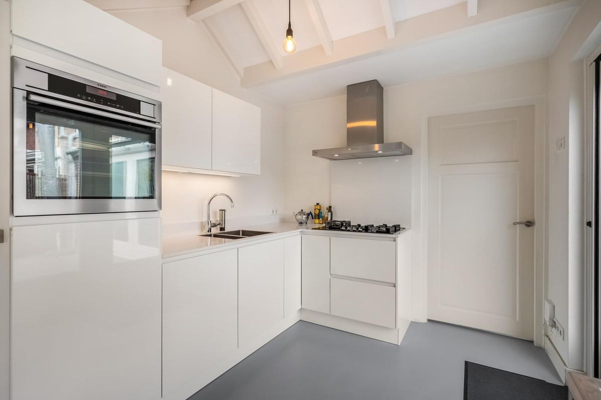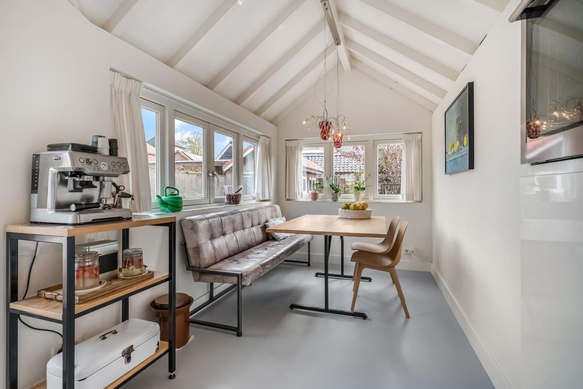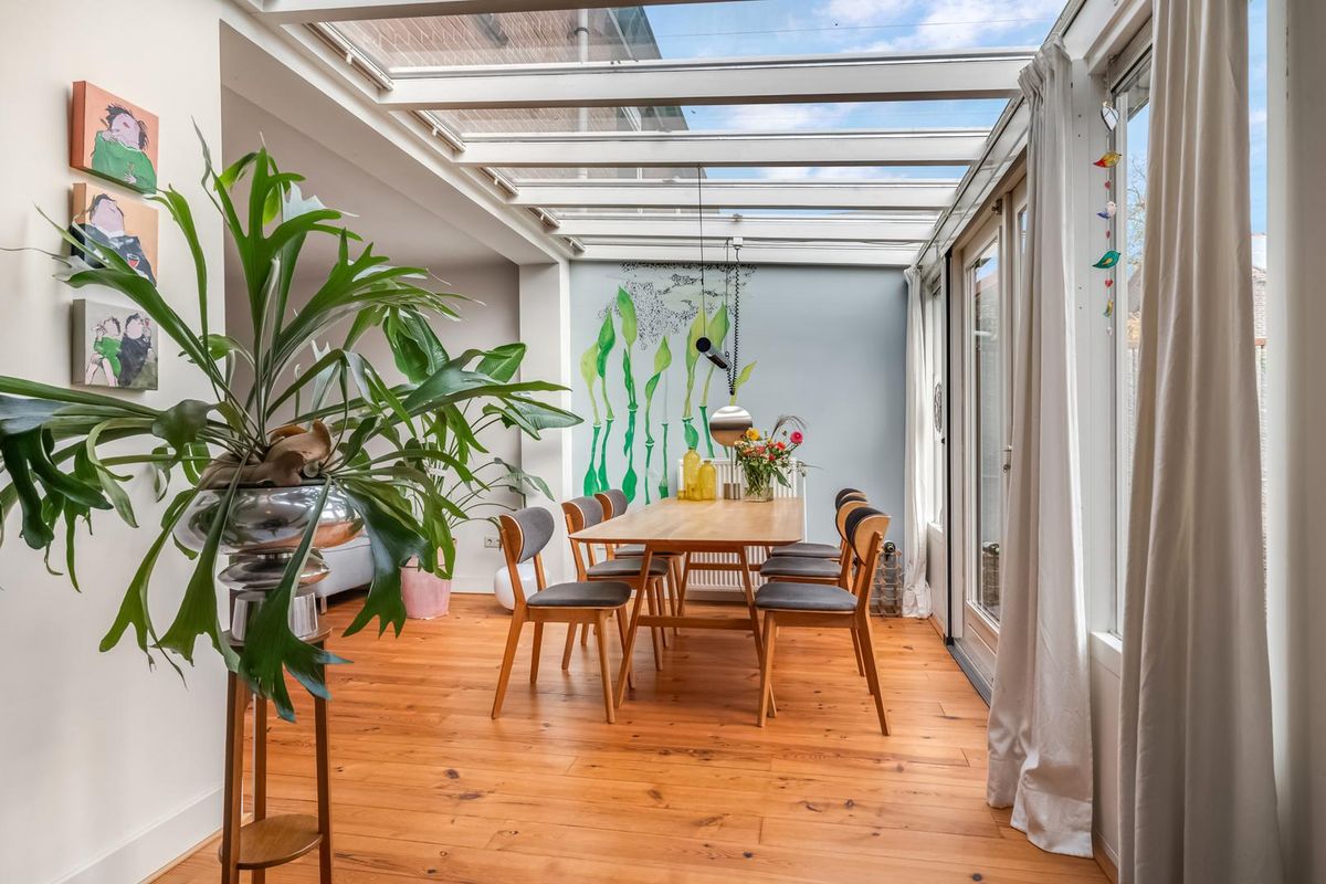 De serre aan de achterzijde is een echte bonus. Door het glazen dak valt hier de hele dag het zonlicht naar binnen. Perfect als eetkamer, werkplek of chillruimte – net wat jij nodig hebt. Direct ernaast ligt de moderne keuken met witte kasten en een licht werkblad. De keuken heeft veel werk- en opbergruimte en is uitgerust met luxe inbouwapparatuur, waaronder een stoomoven en een wokbrander. Praktisch én stijlvol, en je staat zó in verbinding met de rest van het huis en de tuin.