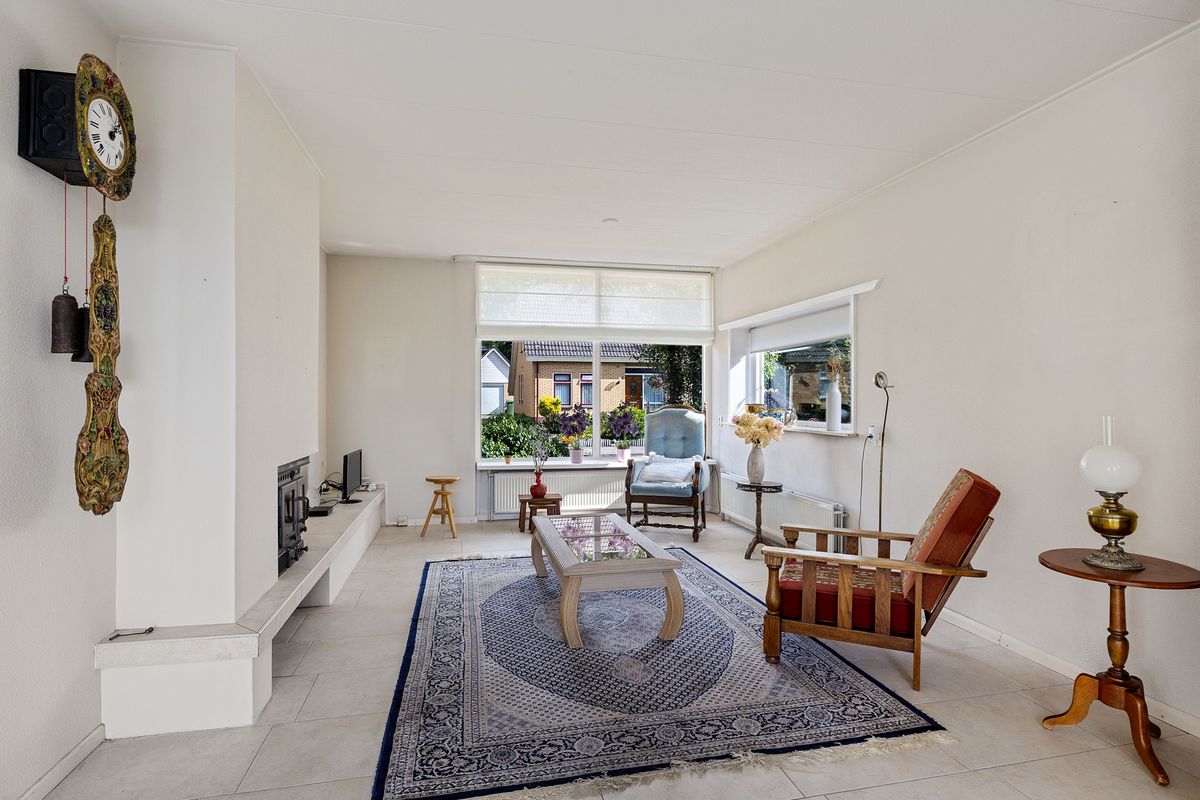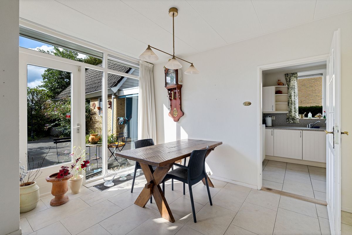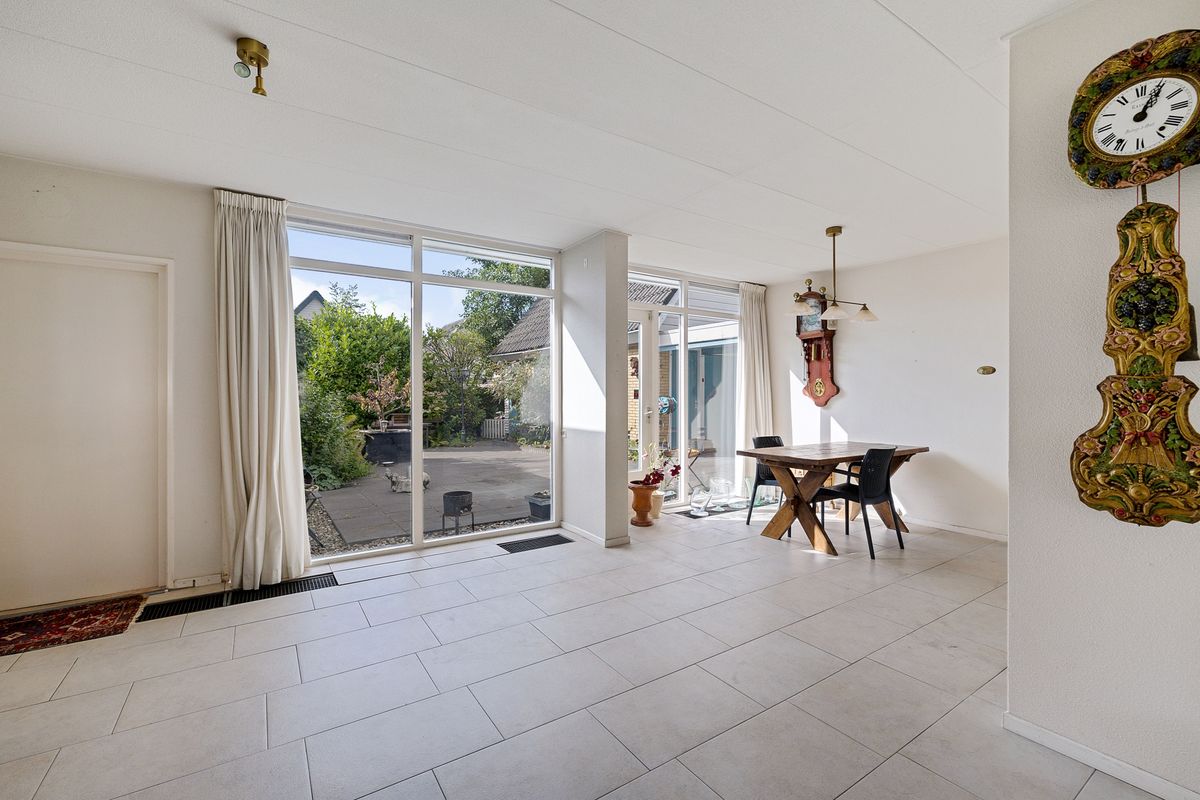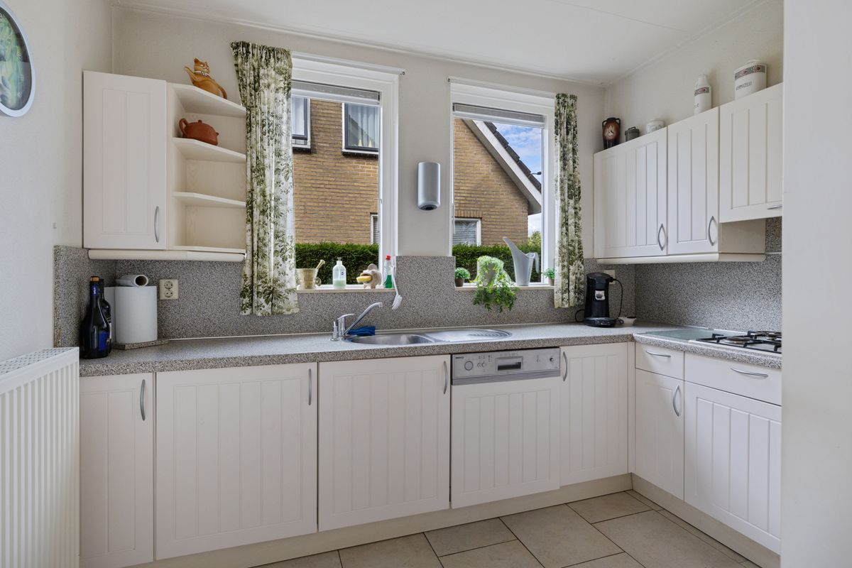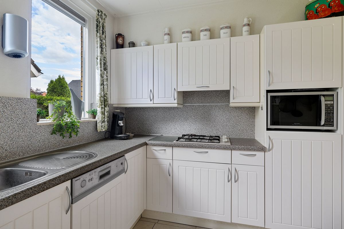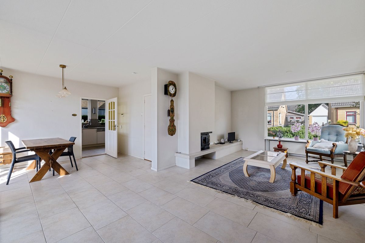 Ruime hal, toilet, trapopgang, ruime lichte woonkamer, dichte keuken met inbouwapparatuur en bijkeuken. Via buitenom naar de garage