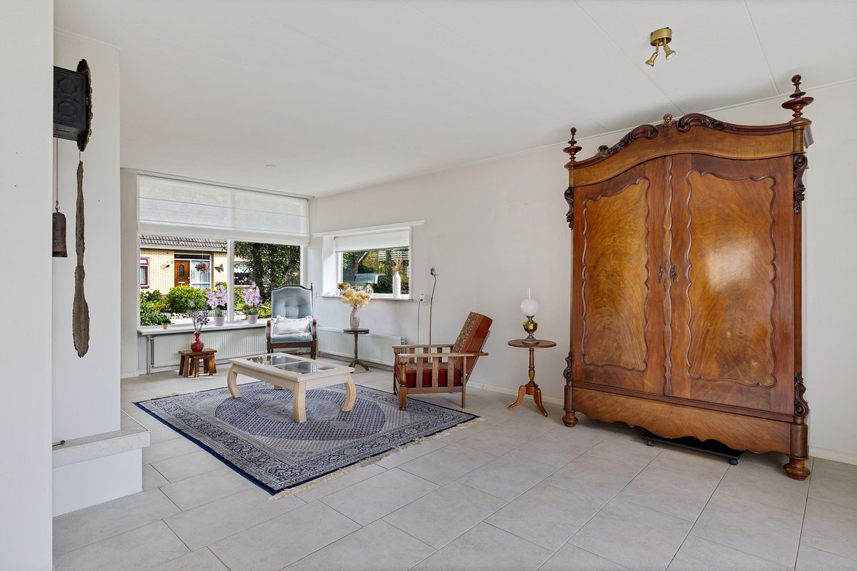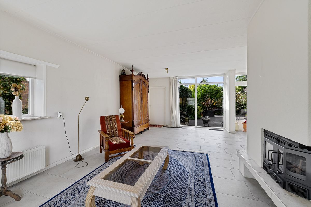 Besloten onderhoudsarme tuin en ruime vrijstaande garage met zolderberging.