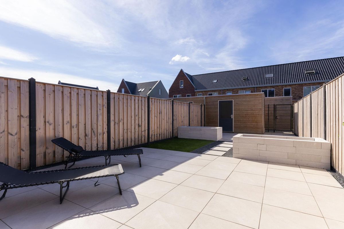 De moderne tuin is volledig aangelegd, gelegen op het zonnige zuidwesten en voorzien van een achterom en een vrijstaande houten berging. Hier geniet je van de middag- en avondzon, privacy en comfort.