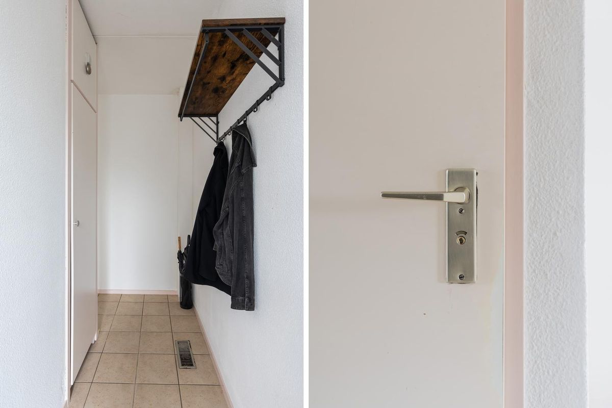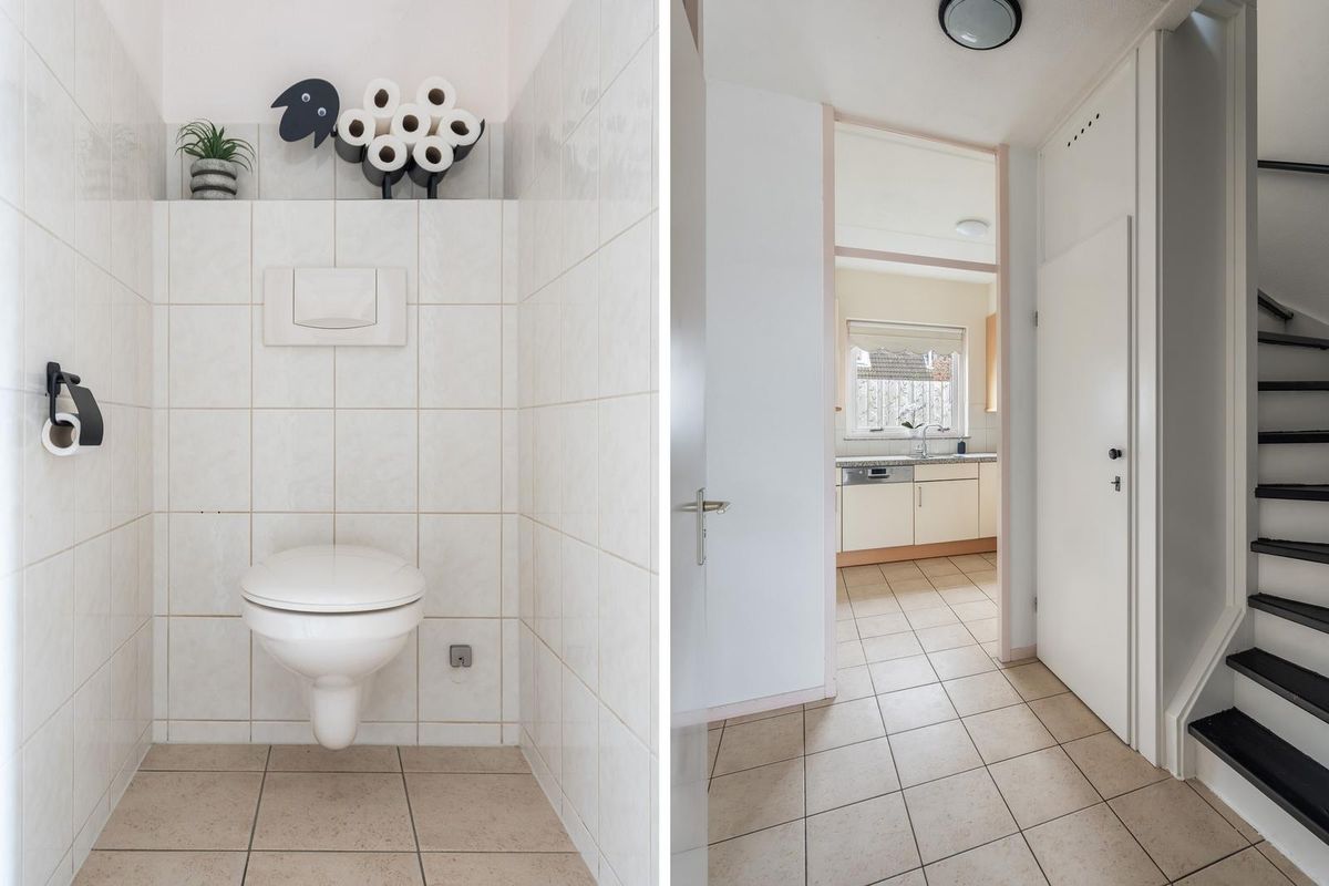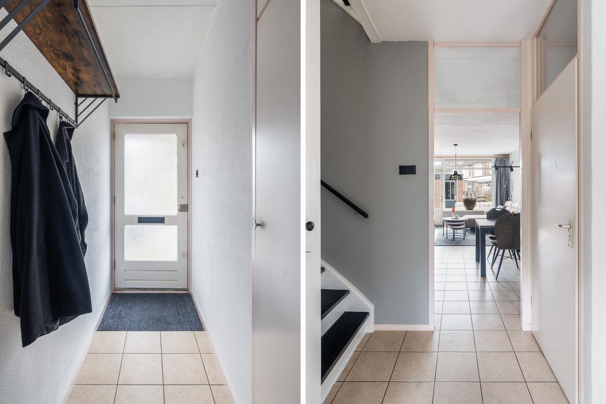 Bij binnenkomst in de hal vindt u de entree met toegang tot de meterkast, de toiletruimte, de trapkast, de keuken en de woonkamer. Tevens is hier ruimte voor een garderobe.