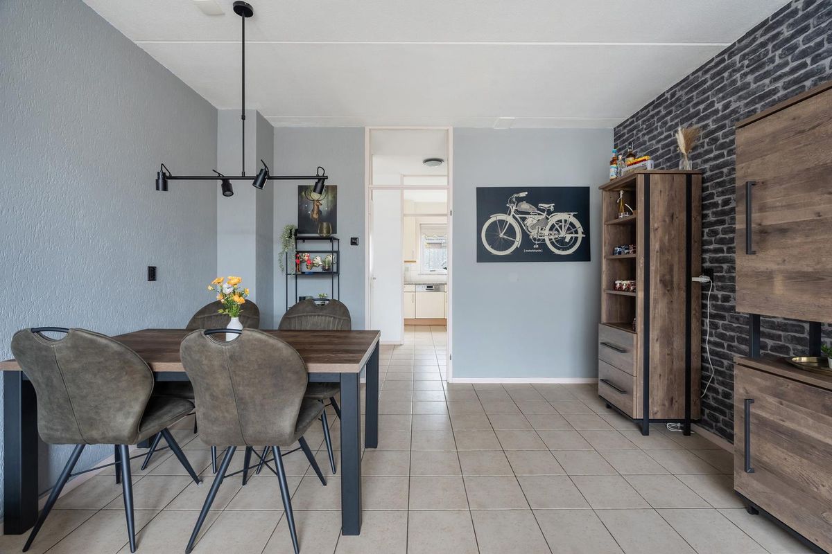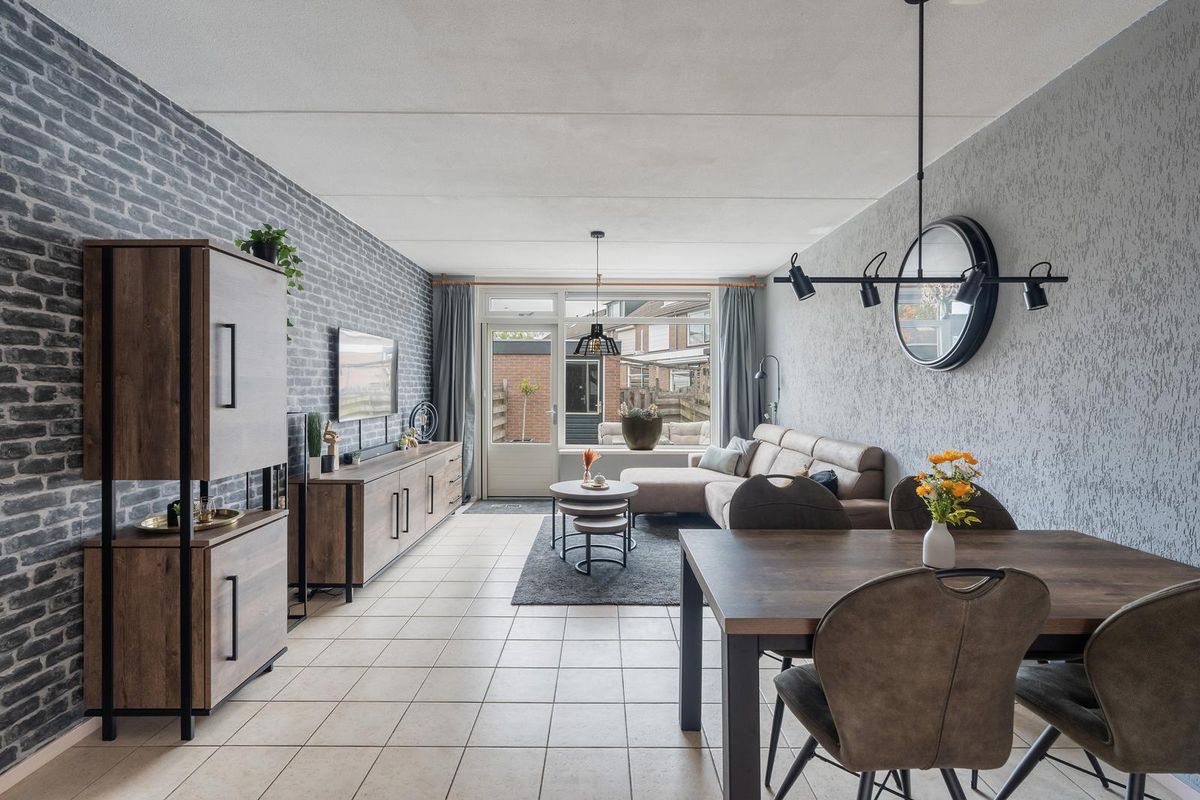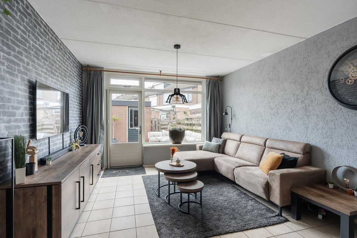 De woonkamer ligt aan de tuinzijde en is uitgevoerd met een plavuizen vloer in een lichte tint. Dankzij de grote raampartijen is het hier heerlijk licht, en via de deur bereikt u direct de achtertuin.