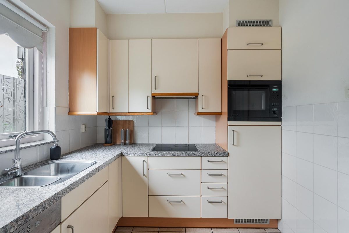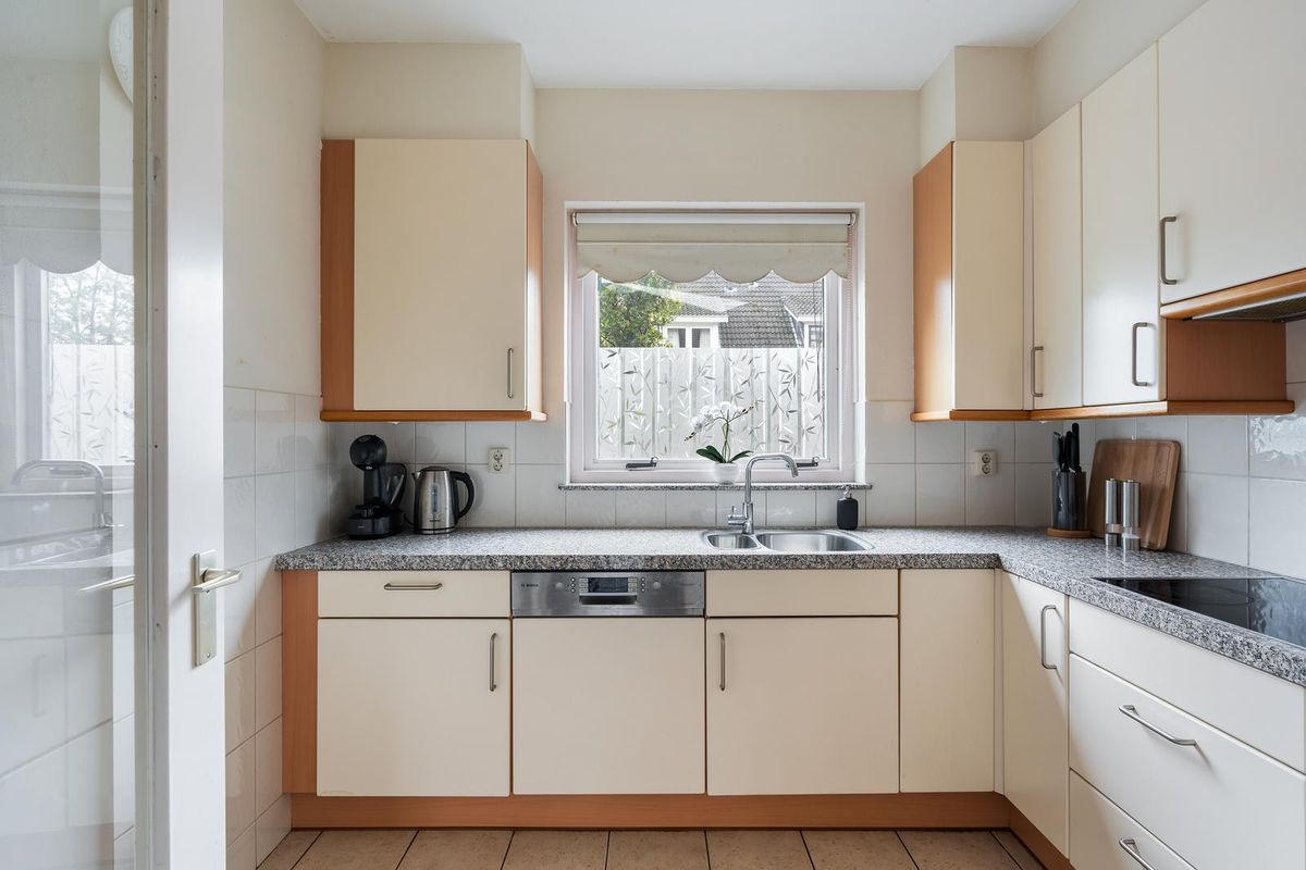De keuken bevindt zich aan de voorzijde van de woning en is uitgevoerd in een royale hoekopstelling. De vanillekleurige kastfronten combineren mooi met de stenen werkbladen, wat zorgt voor een warme, eigentijdse uitstraling. De betegelde achterwanden en de nette afwerking maken het geheel compleet. De keuken beschikt over diverse inbouwapparatuur, waaronder een vaatwasser, inductiekookplaat, 1,5e spoelbak en een combimagnetron. Er is bovendien veel praktische kastruimte aanwezig.