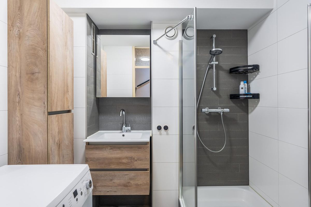 De badkamer is zeer netjes afgewerkt en voorzien van een douchecabine, wastafel met meubel en kast, en de opstelling voor de wasmachine. De betegeling tot aan het plafond in een grijs-wit kleurstelling en de houtlook kasten geven de ruimte een frisse en moderne uitstraling.