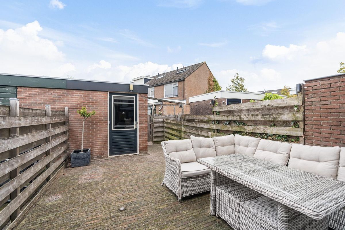 De achtertuin is volledig betegeld en daardoor nagenoeg onderhoudsvrij. Hier kunt u optimaal genieten van de zon en het buitenleven door de ligging op het noorden. Achterin de tuin staat een stenen berging, en via de achterom is de tuin ook vanaf buiten bereikbaar.