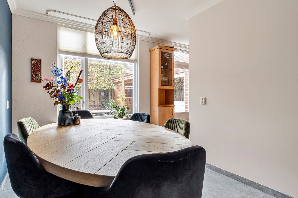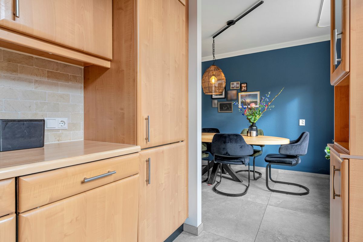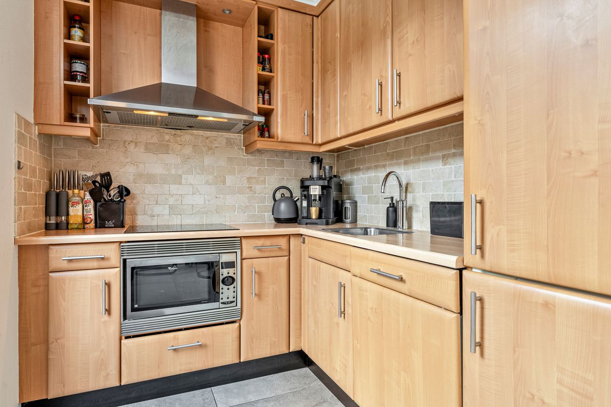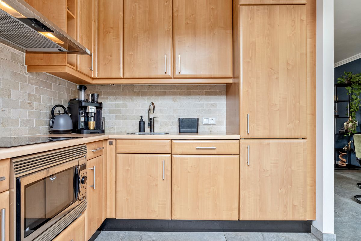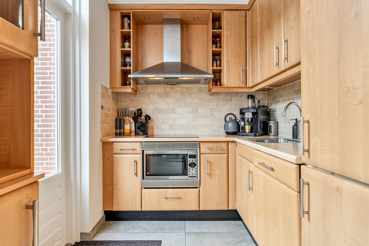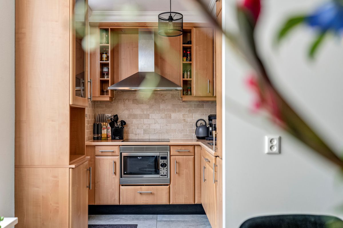 De keuken is praktisch ingedeeld en voorzien van een L-vormige opstelling met moderne apparatuur: een nieuwe inductiekookplaat, magnetron, spoelbak, afzuigkap, koel-vriescombinatie en vaatwasser. De tuindeur biedt directe toegang tot de zonnige achtertuin.