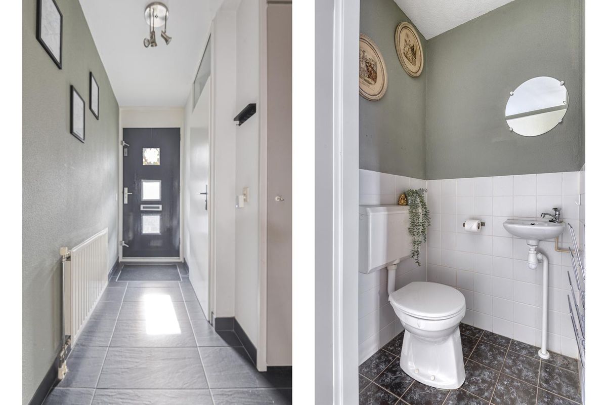 De entree (met de meterkast) geeft toegang tot de toiletruimte, de woonkamer en via een vaste trap tot de eerste verdieping.